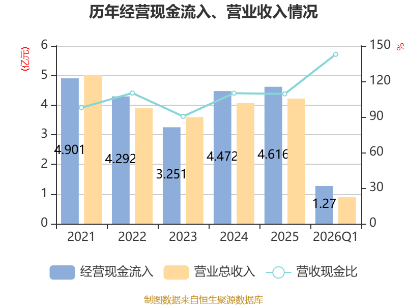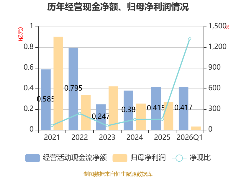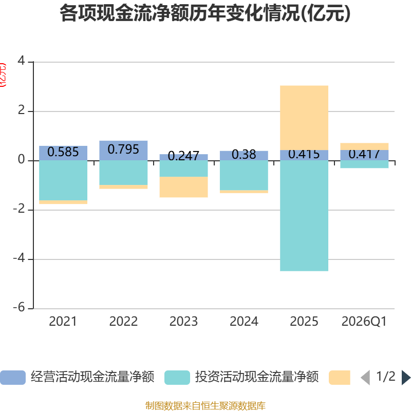 截至2026年一季度末,公司经营活动现金流净额为4166.5万元,同比增长672.74%;筹资活动现金流净额2831.41万元,同比增加959.18万元;投资活动现金流净额-3180.13万元,上年同期为-3428.15万元。