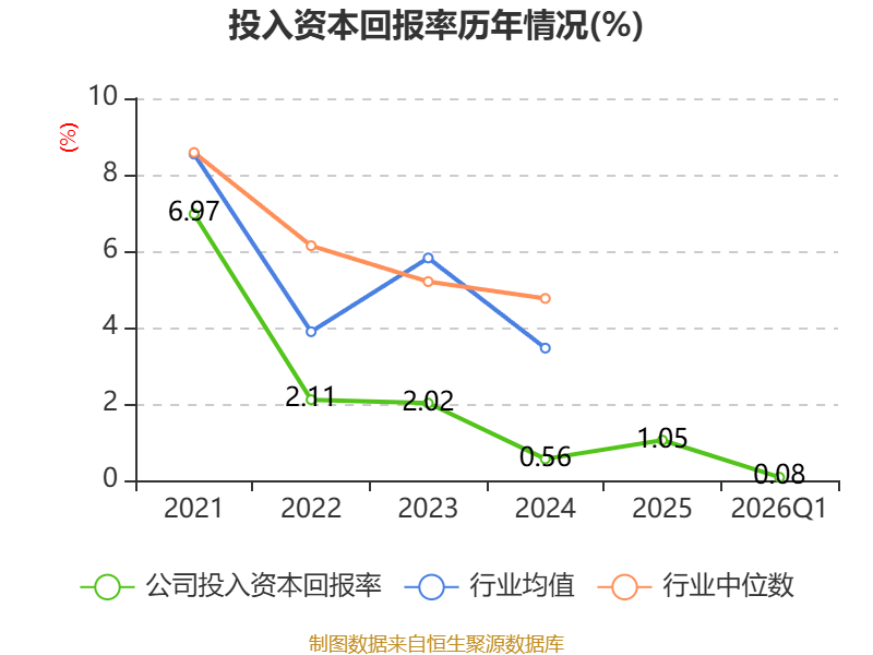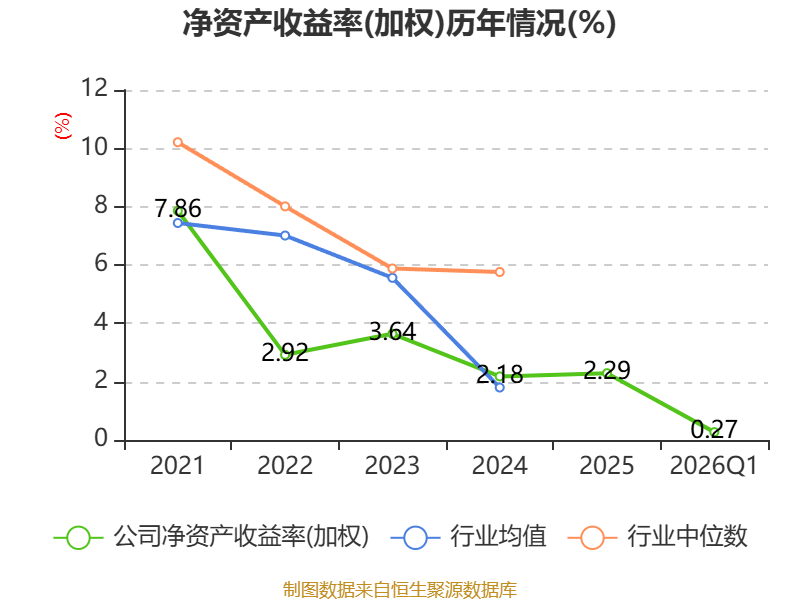 盈利能力方面, 2026年一季度公司加权平均净资产收益率为0.27%,同比下降0.15个百分点。公司2026年第一季度投入资本回报率为0.08%,较上年同期下降0.07个百分点。