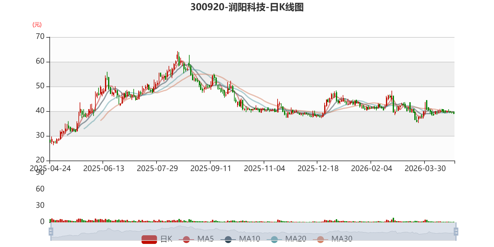 中证智能财讯润阳科技(300920)4月24日披露2026年第一季度报告。公司实现营业总收入8896.9万元,同比下降7.36%;归母净利润315.14万元,同比下降36.34%;扣非净利润288.39万元,同比下降40.11%;经营活动产生的现金流量净额为4166.5万元,同比增长672.74%;报告期内,润阳科技基本每股收益为0.0315元,加权平均净资产收益率为0.27%。