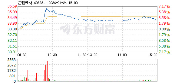 4月24日,江瀚新材盘中涨幅达5%,截至10点16分,报35元,成交7037.77万元,换手率0.55%。