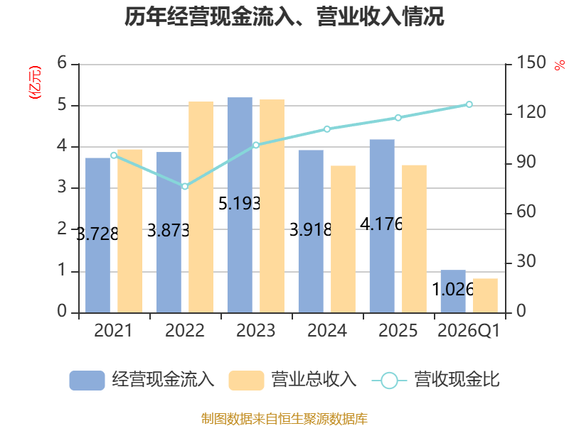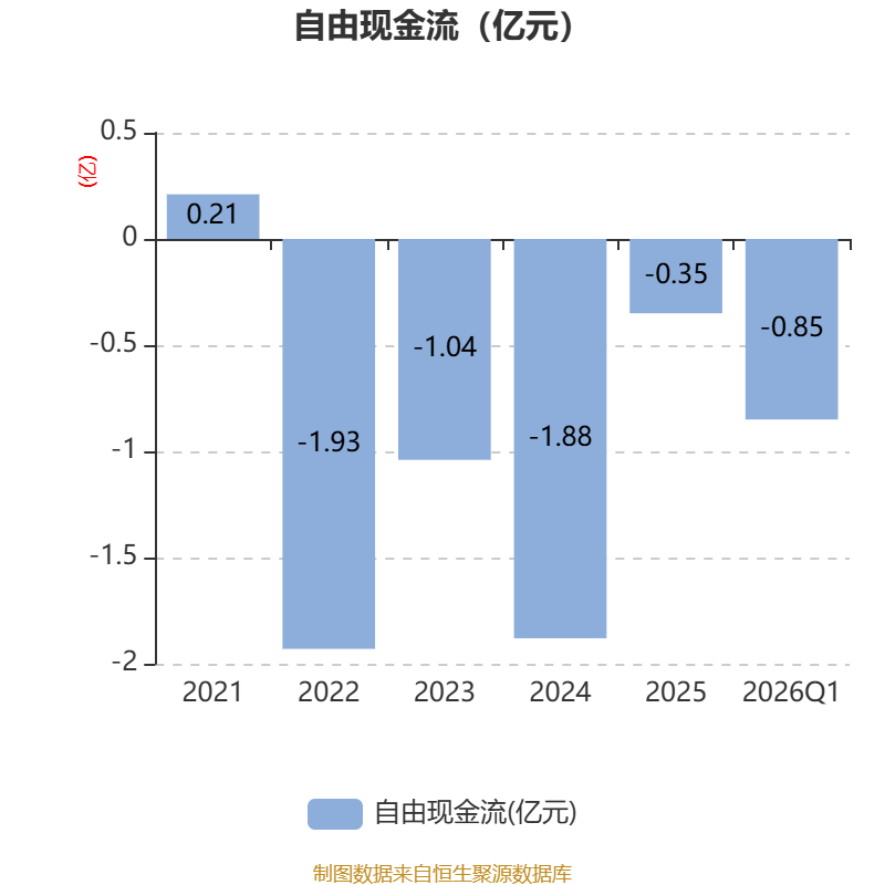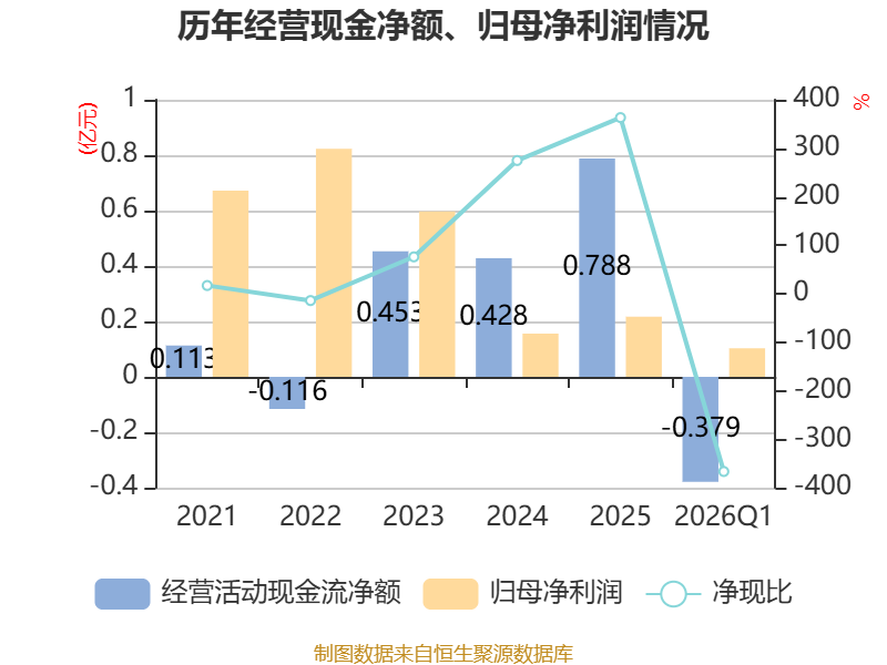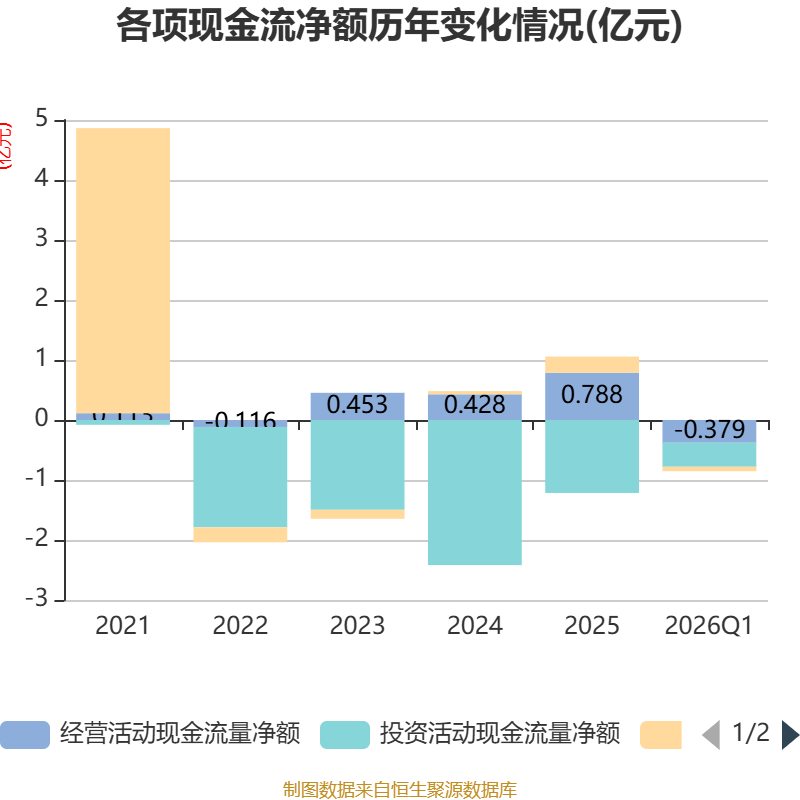 截至2026年一季度末,公司经营活动现金流净额为-3793.57万元,同比减少2642.12万元;筹资活动现金流净额-739.8万元,同比减少1093.39万元;投资活动现金流净额-3995.6万元,上年同期为-8512.69万元。