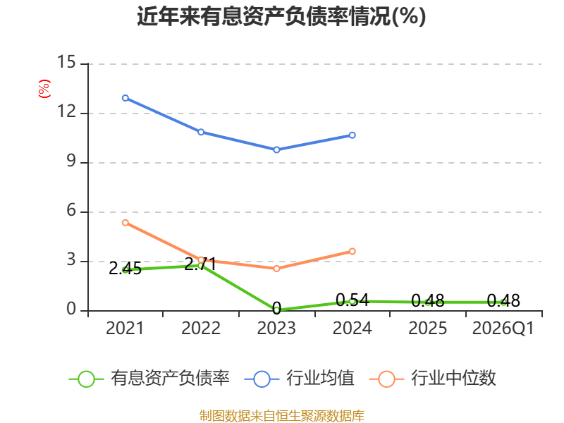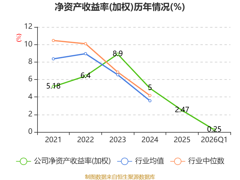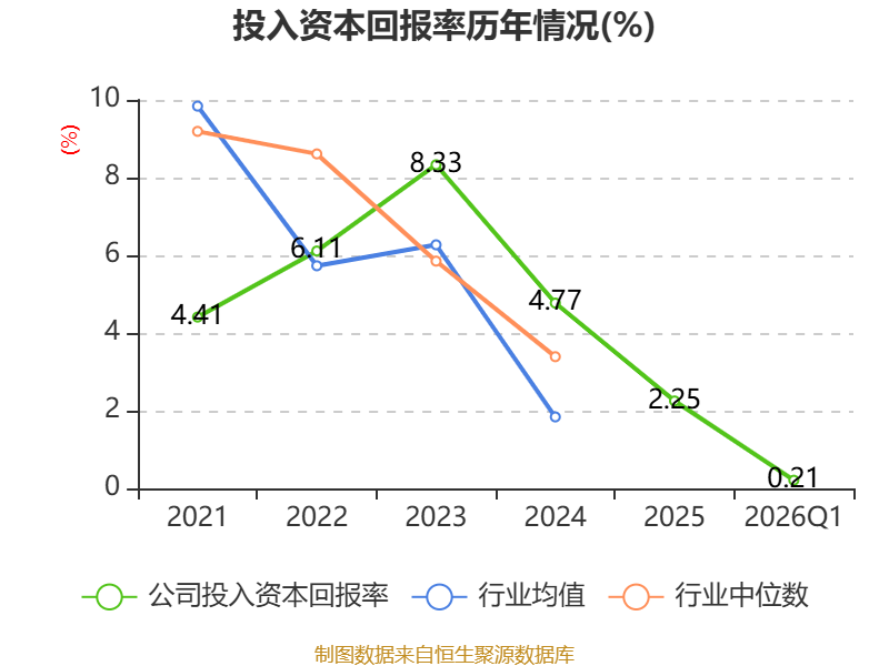 盈利能力方面, 2026年一季度公司加权平均净资产收益率为0.25%,同比下降0.58个百分点。公司2026年第一季度投入资本回报率为0.21%,较上年同期下降0.57个百分点。