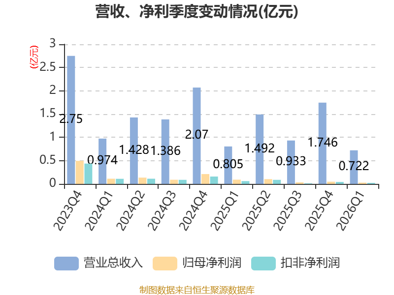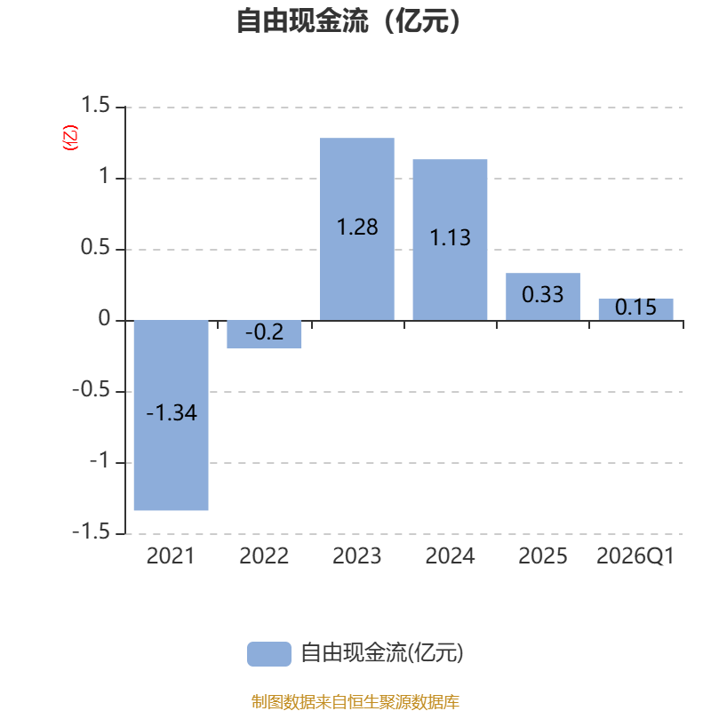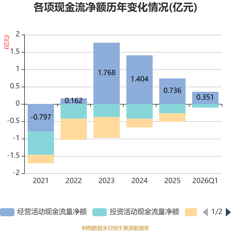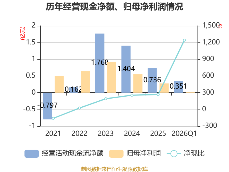 截至2026年一季度末,公司经营活动现金流净额为3510.83万元,同比增长1050.29%;筹资活动现金流净额-3.65万元,同比增加101.43万元;投资活动现金流净额-1065.54万元,上年同期为-1141.34万元。
