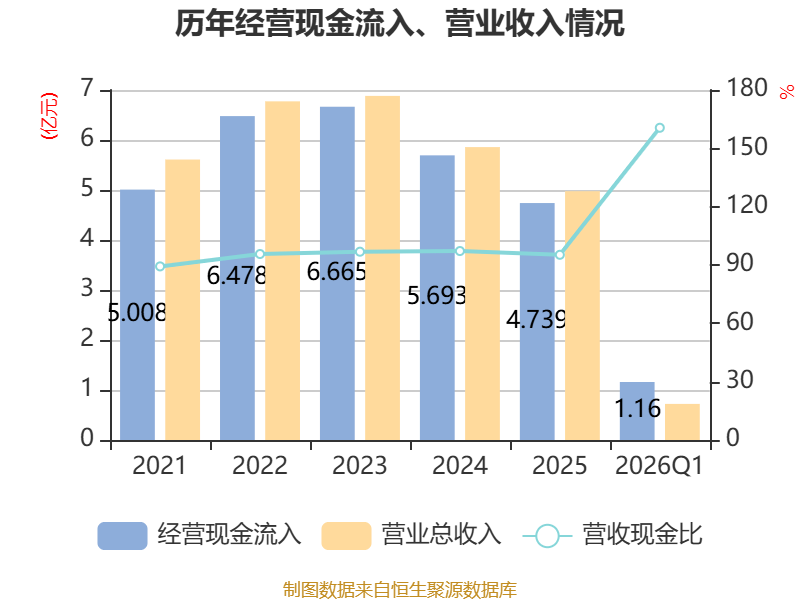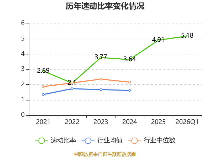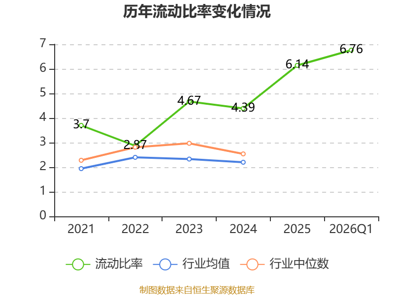 2026年第一季度,公司流动比率为6.76,速动比率为5.18。