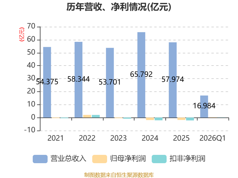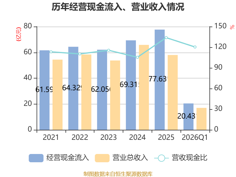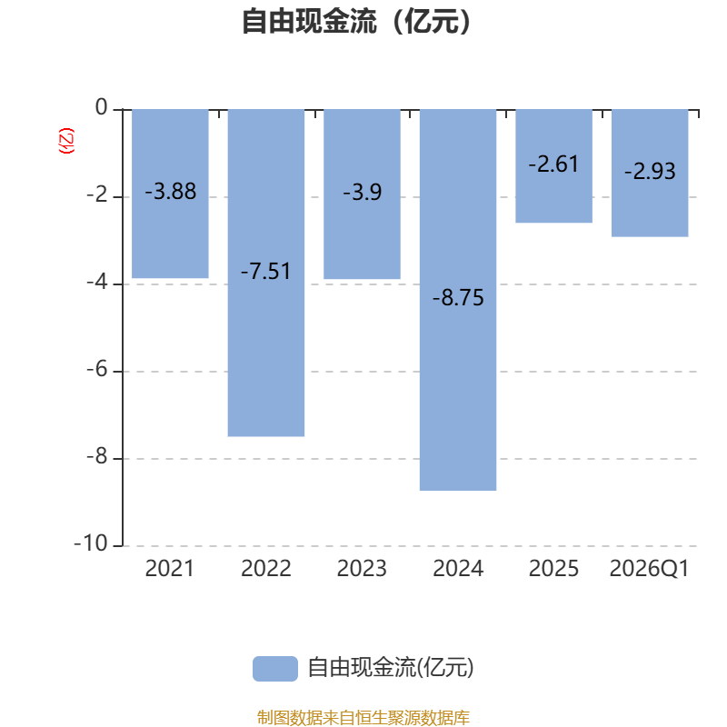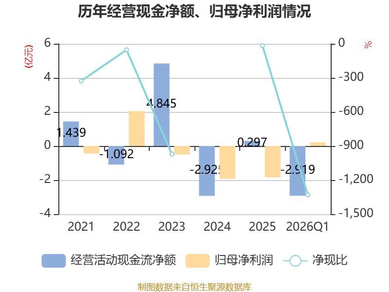 截至2026年一季度末,公司经营活动现金流净额为-2.92亿元,同比减少1.59亿元;筹资活动现金流净额4.47亿元,同比增加1.26亿元;投资活动现金流净额2.55亿元,上年同期为111.66万元。