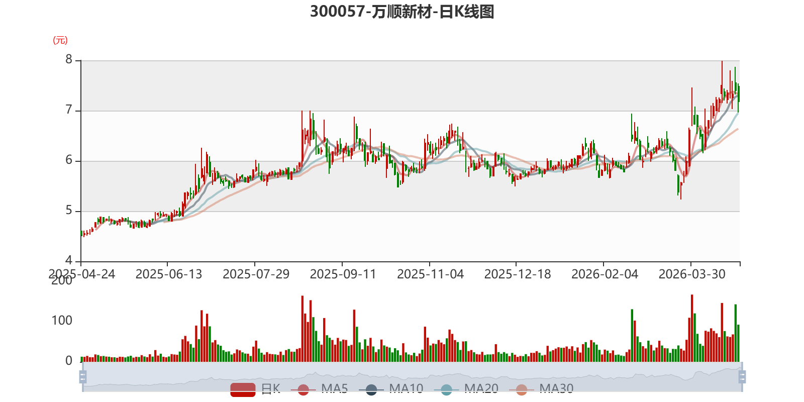 中证智能财讯万顺新材(300057)4月24日披露2026年第一季度报告。公司实现营业总收入16.98亿元,同比增长16.21%;归母净利润2193.73万元,同比扭亏;扣非净利润1486.87万元,同比扭亏;经营活动产生的现金流量净额为-2.92亿元,上年同期为-1.32亿元;报告期内,万顺新材基本每股收益为0.0244元,加权平均净资产收益率为0.43%。