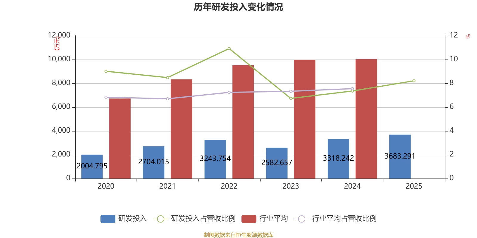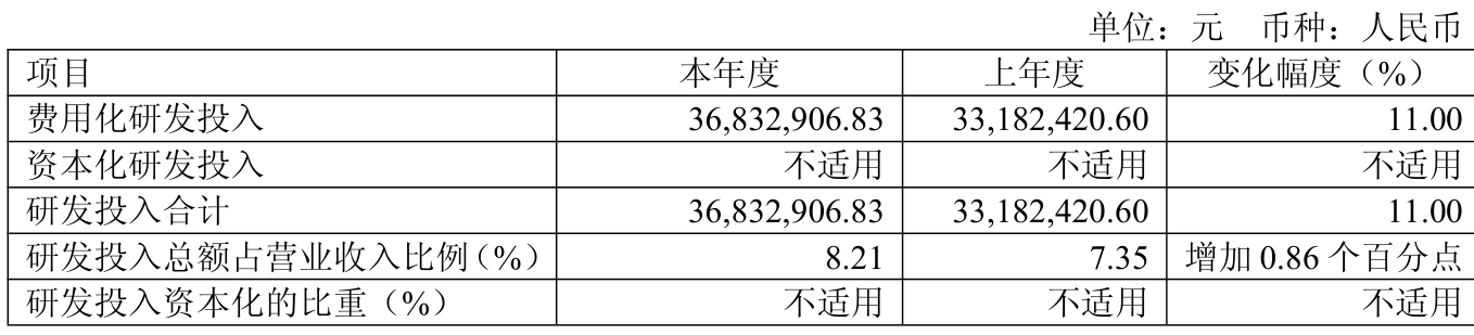 2025年全年,公司研发投入金额为3683.29万元,同比增长11%;研发投入占营业收入比例为8.21%,相比上年同期上升0.86个百分点。