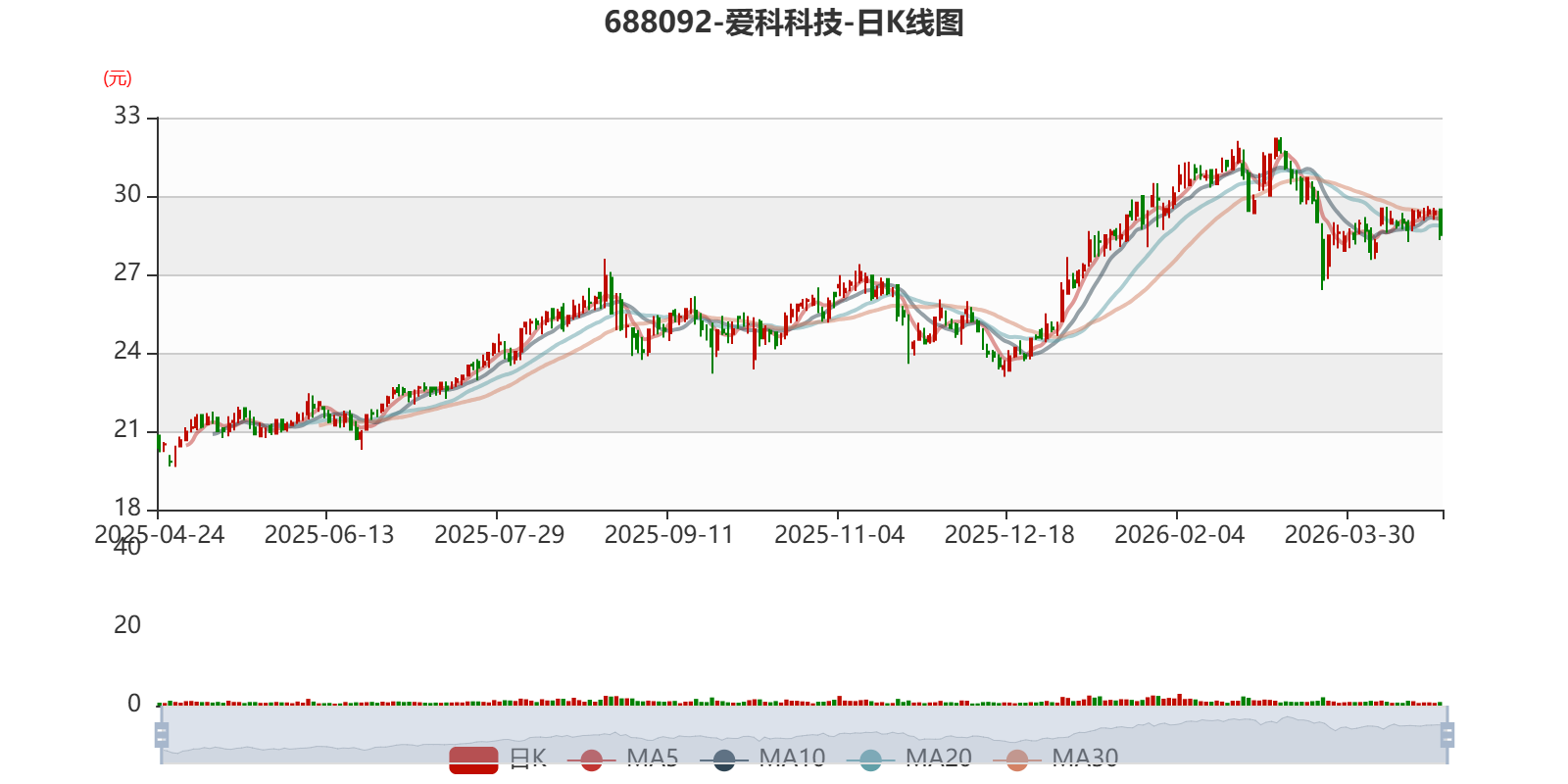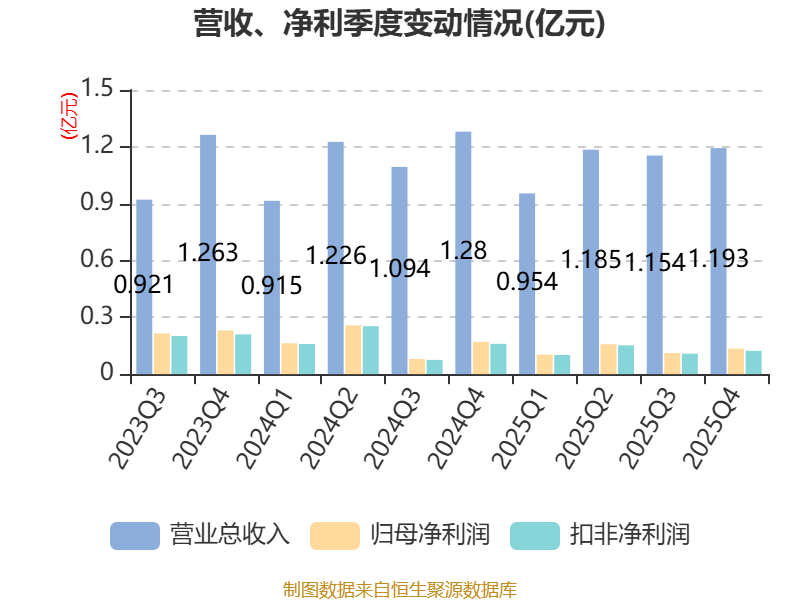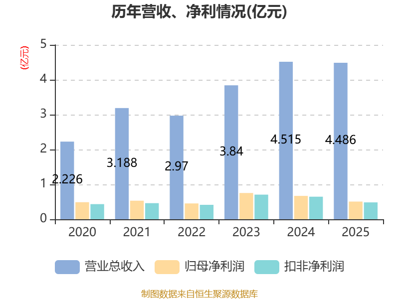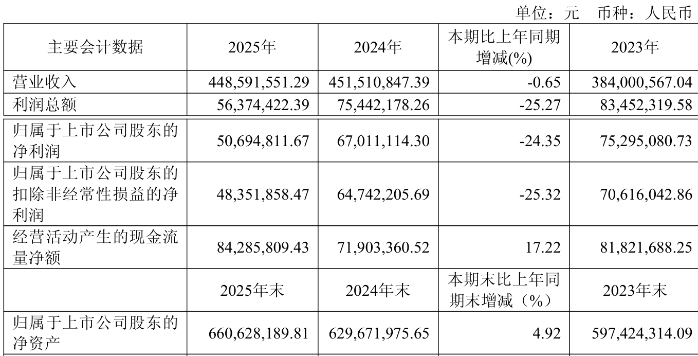 中证智能财讯爱科科技(688092)4月24日披露2025年年度报告。2025年,公司实现营业总收入4.49亿元,同比下降0.65%;归母净利润5069.48万元,同比下降24.35%;扣非净利润4835.19万元,同比下降25.32%;经营活动产生的现金流量净额为8428.58万元,同比增长17.22%;报告期内,爱科科技基本每股收益为0.61元,加权平均净资产收益率为7.86%。公司2025年度分配预案为:拟向全体股东每10股派现1.7元(含税)。