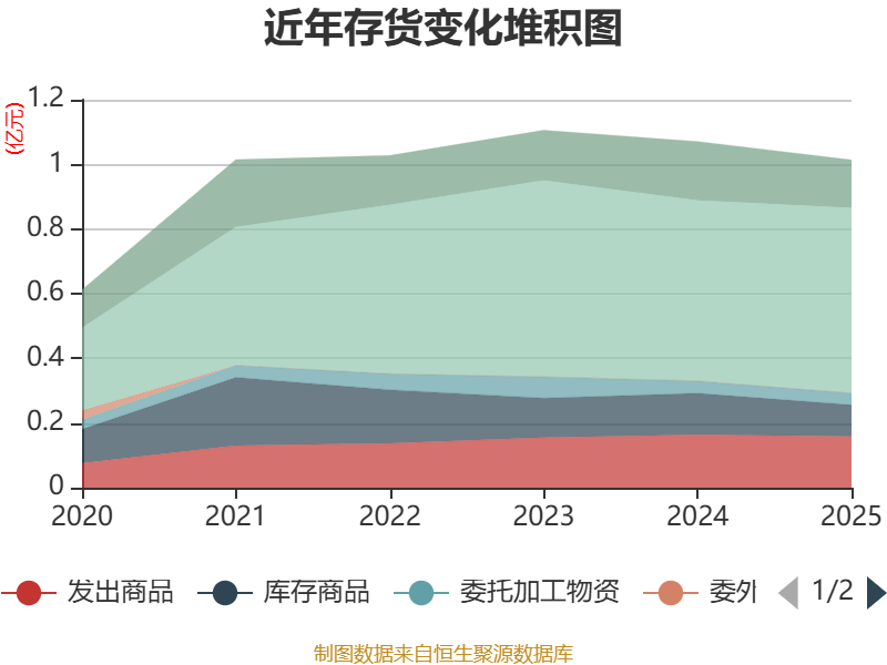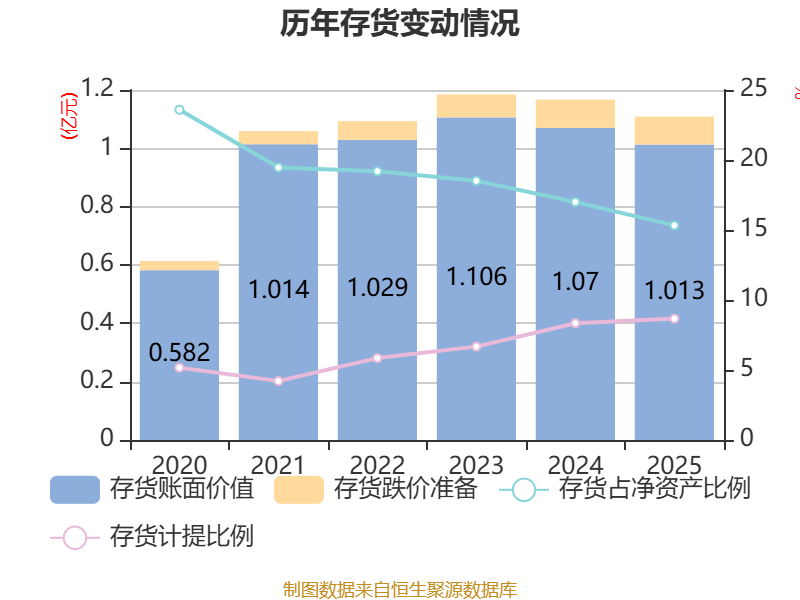 从存货变动来看,截至2025年末,公司存货账面价值为1.01亿元,占净资产的15.33%,较上年末减少574.72万元。其中,存货跌价准备为961.02万元,计提比例为8.67%。