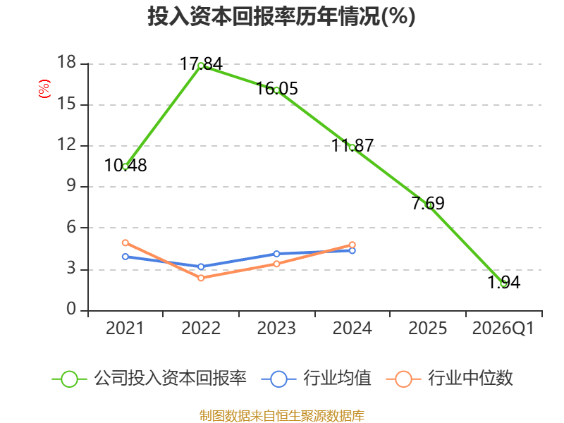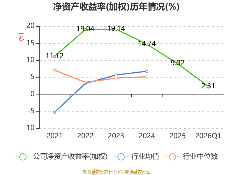 盈利能力方面, 2026年一季度公司加权平均净资产收益率为2.31%,同比下降0.17个百分点。公司2026年第一季度投入资本回报率为1.94%,较上年同期下降0.19个百分点。