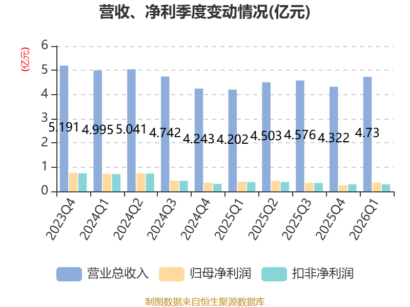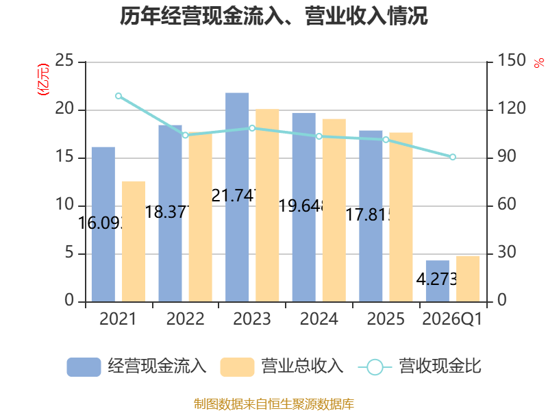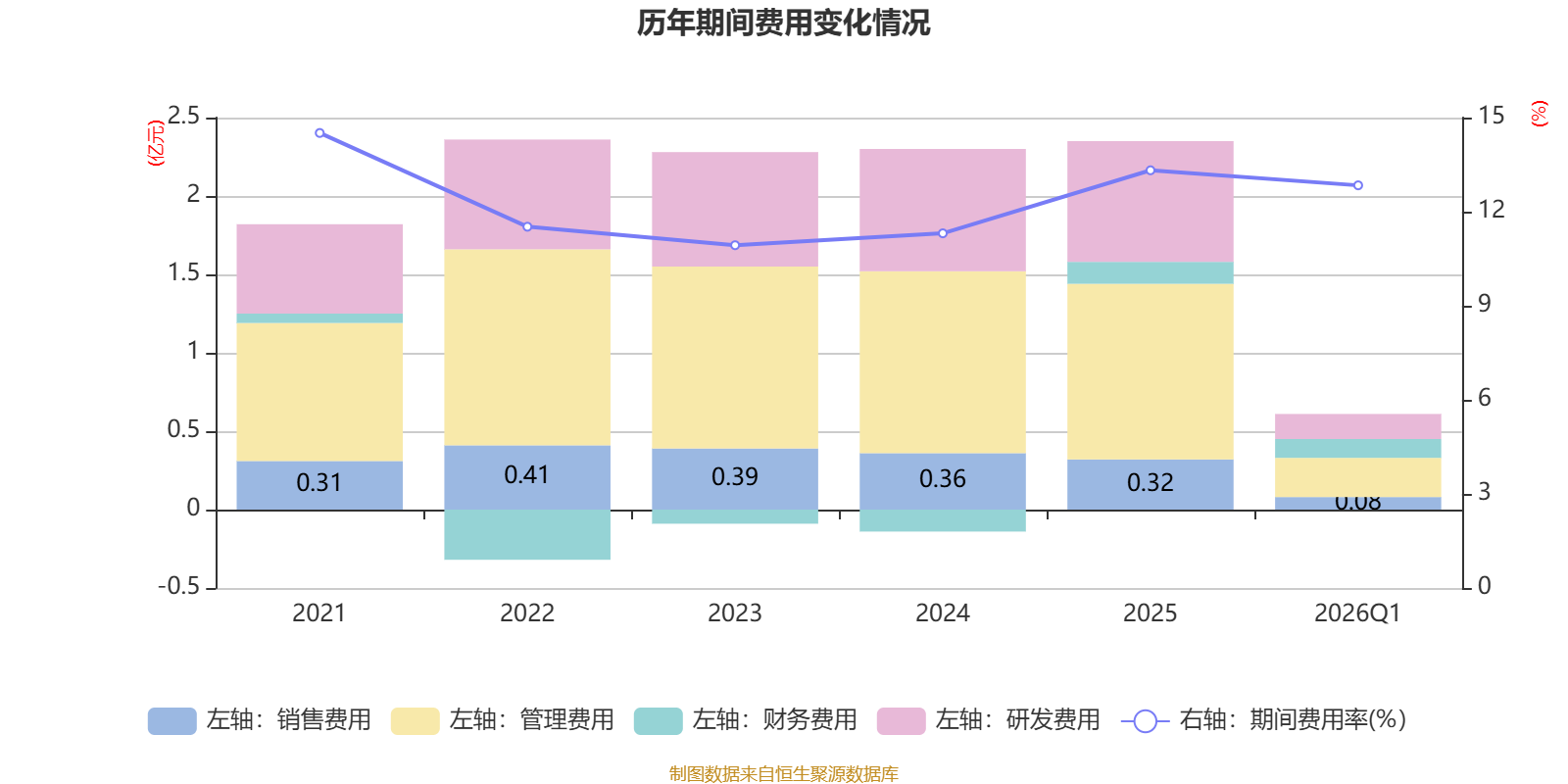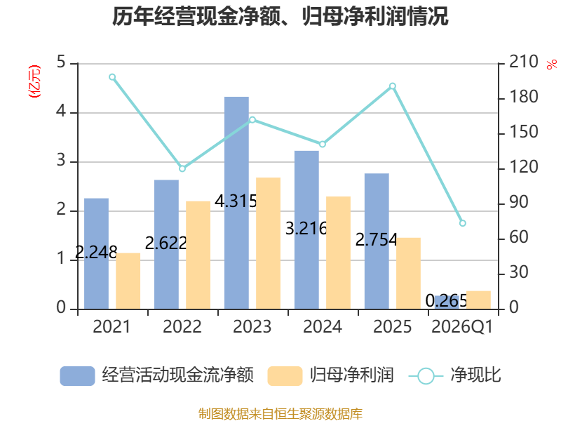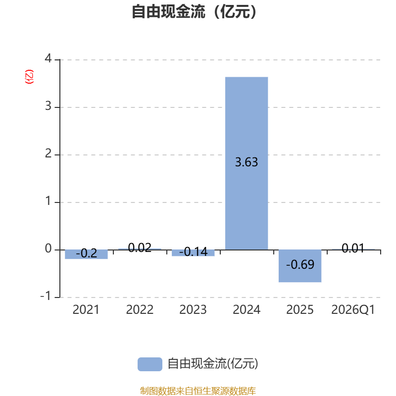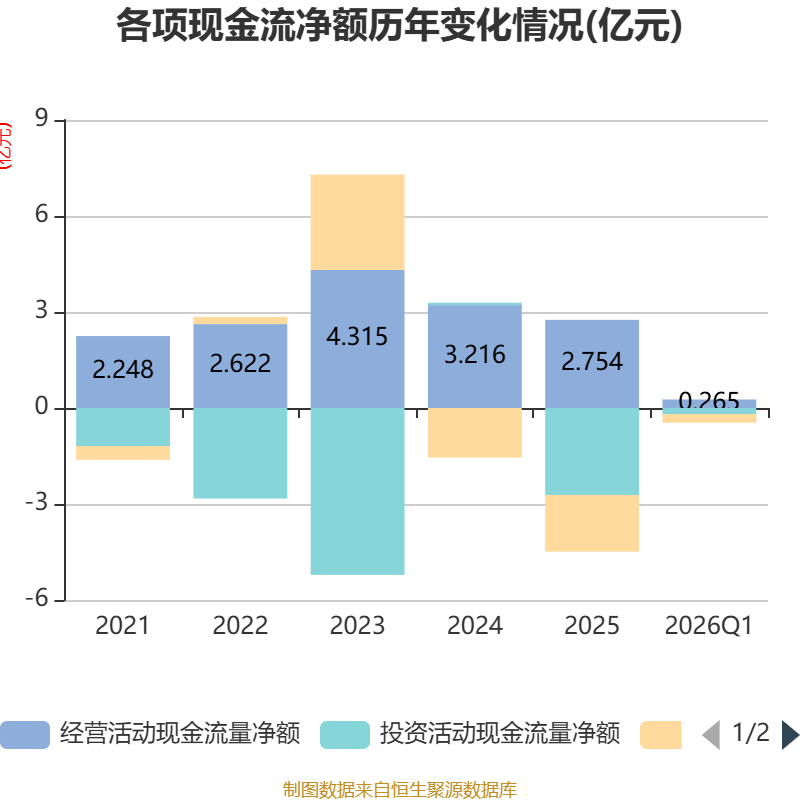 截至2026年一季度末,公司经营活动现金流净额为2645.09万元,同比下降51.45%;筹资活动现金流净额-2665.14万元,同比减少2622.46万元;投资活动现金流净额-1922.81万元,上年同期为-2804.25万元。