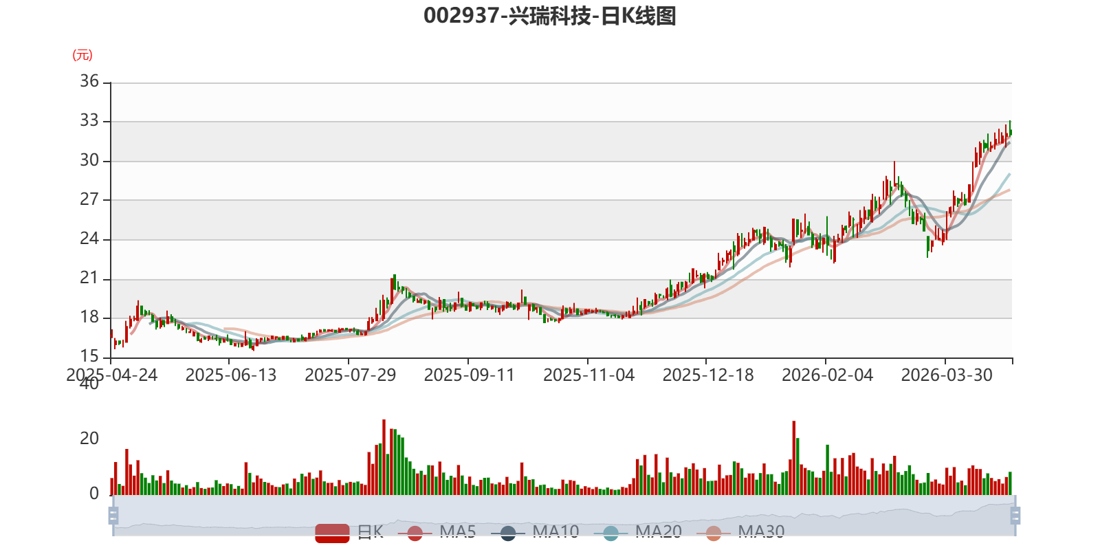 中证智能财讯兴瑞科技(002937)4月24日披露2026年第一季度报告。公司实现营业总收入4.73亿元,同比增长12.57%;归母净利润3617.69万元,同比下降9.95%;扣非净利润2898.91万元,同比下降24.69%;经营活动产生的现金流量净额为2645.09万元,同比下降51.45%;报告期内,兴瑞科技基本每股收益为0.12元,加权平均净资产收益率为2.31%。