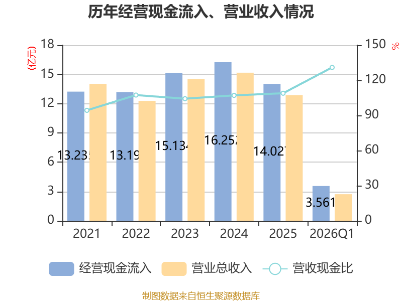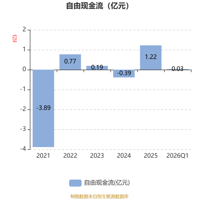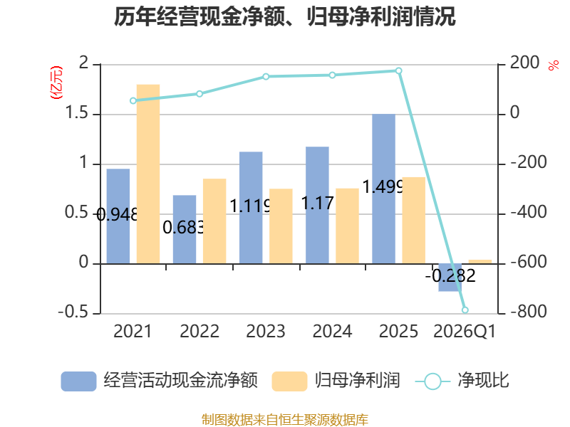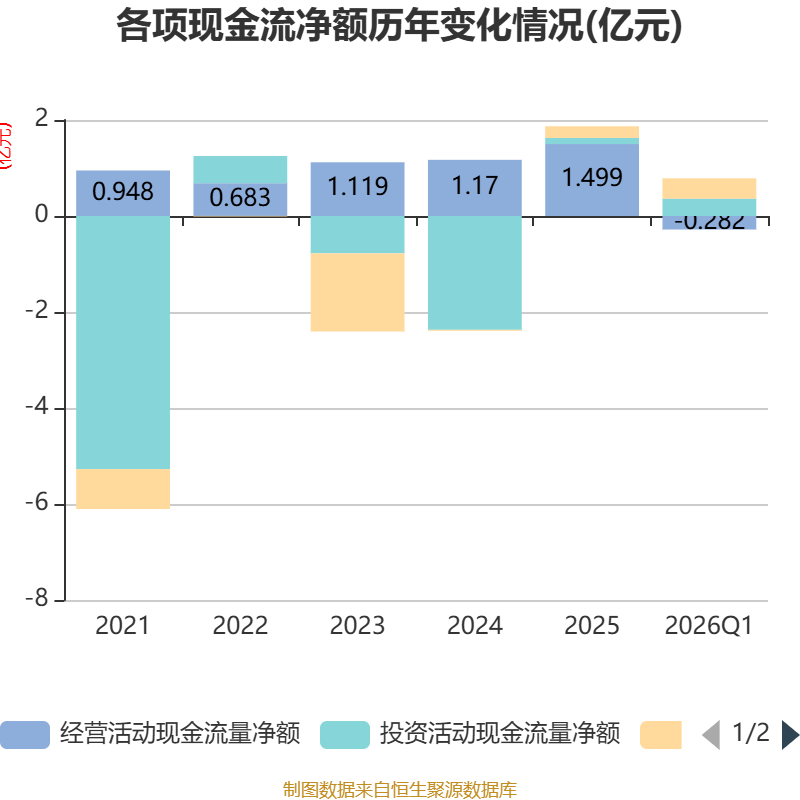 截至2026年一季度末,公司经营活动现金流净额为-2816.61万元,同比减少2473.01万元;筹资活动现金流净额4229.57万元,同比减少252.58万元;投资活动现金流净额3619.74万元,上年同期为1.62亿元。