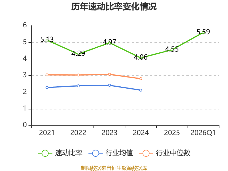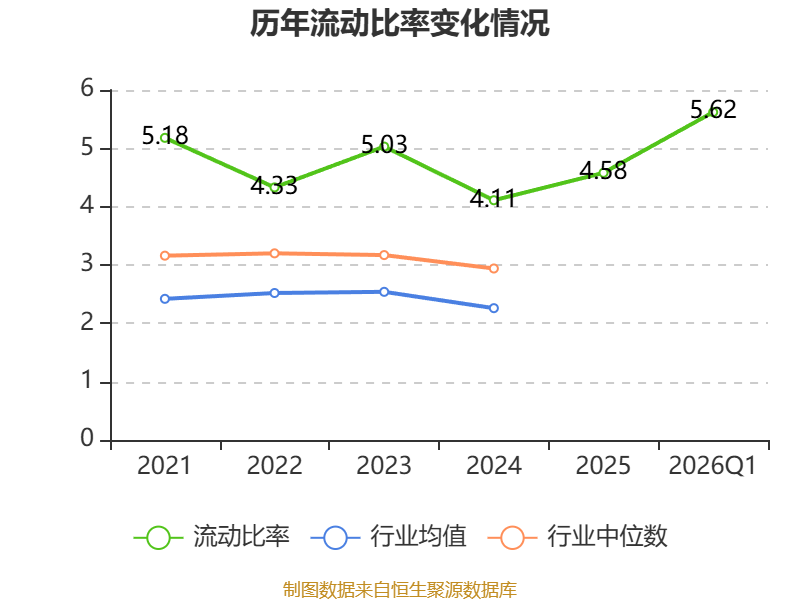 2026年第一季度,公司流动比率为5.62,速动比率为5.59。
