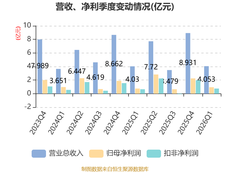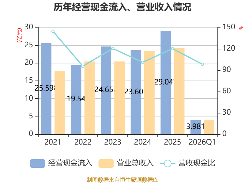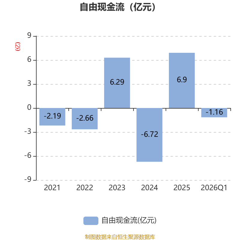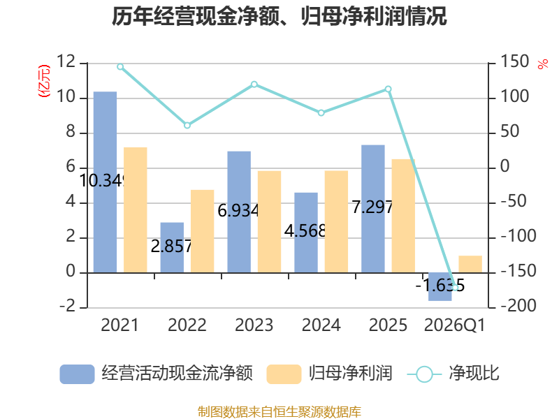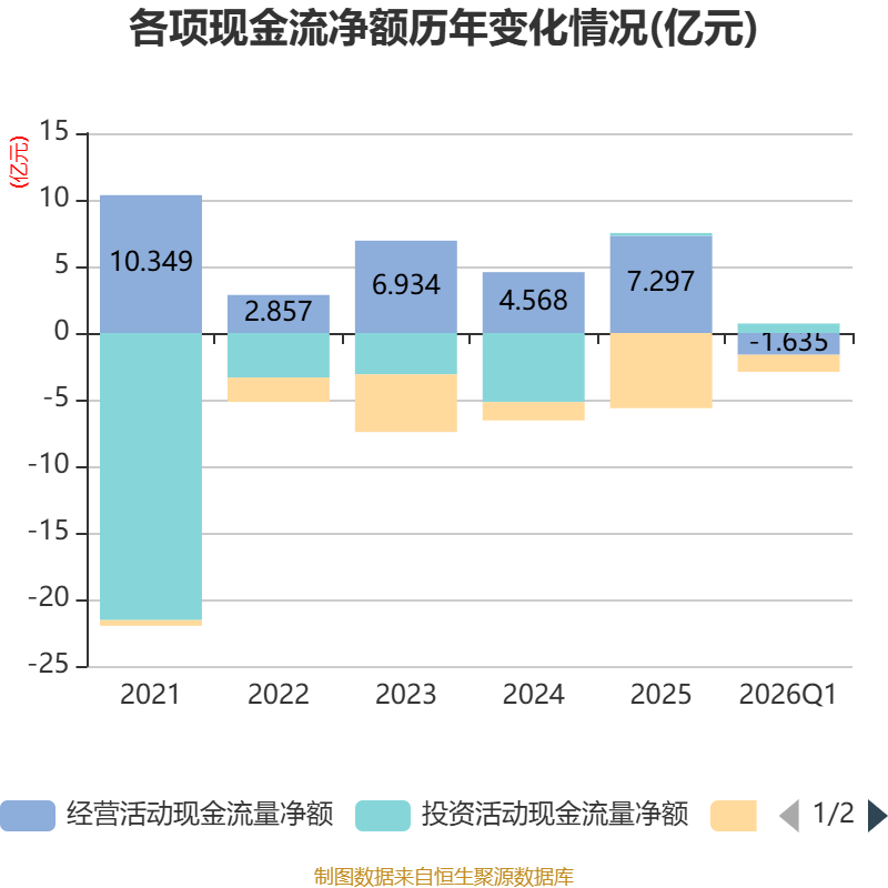 截至2026年一季度末,公司经营活动现金流净额为-1.63亿元,同比减少4.19亿元;筹资活动现金流净额-1.28亿元,同比减少1.04亿元;投资活动现金流净额7108.47万元,上年同期为1.02亿元。
