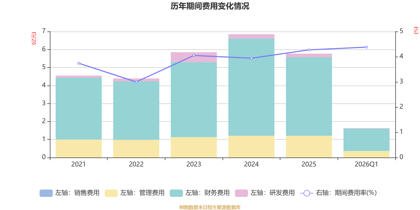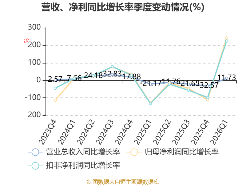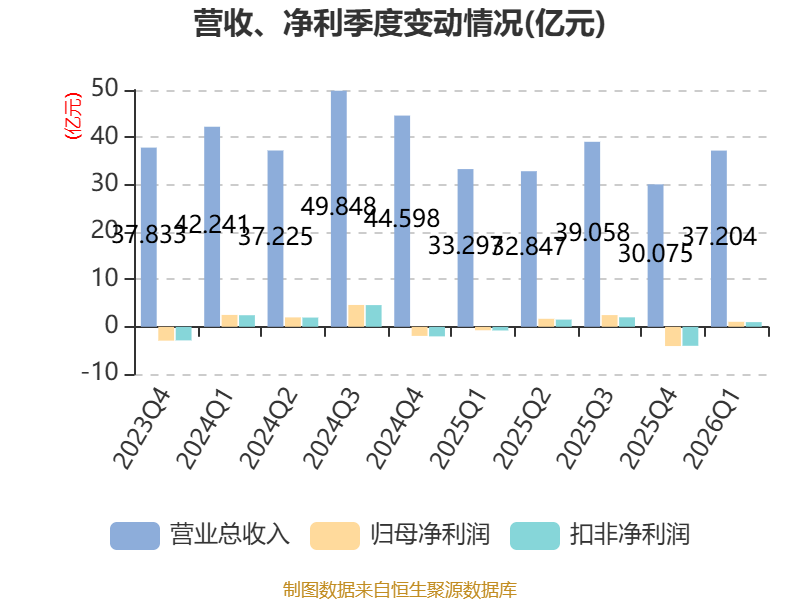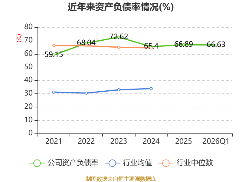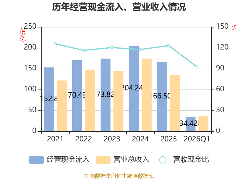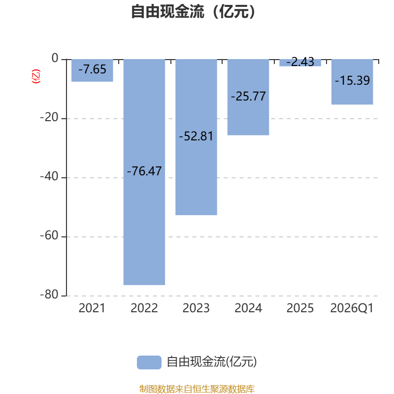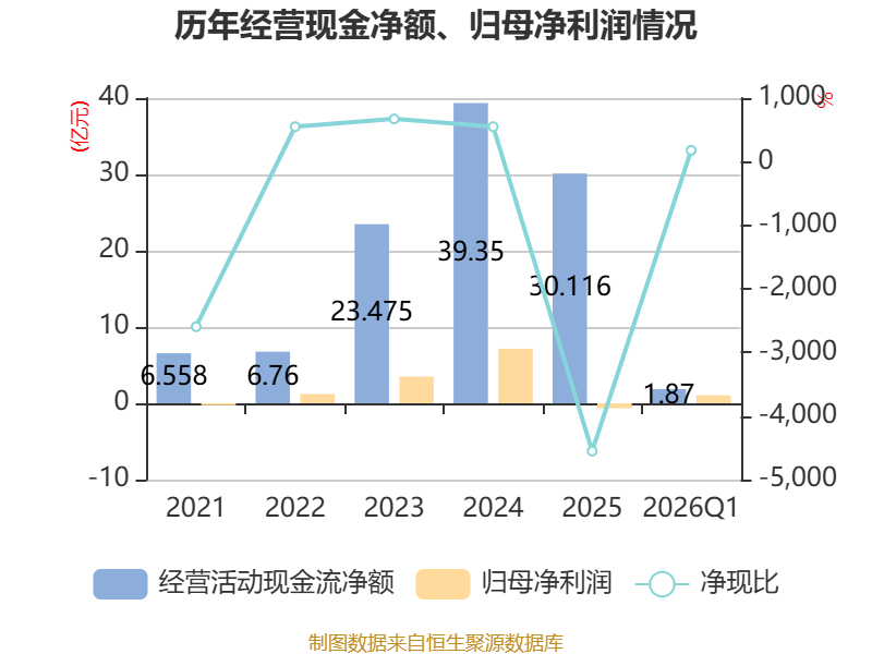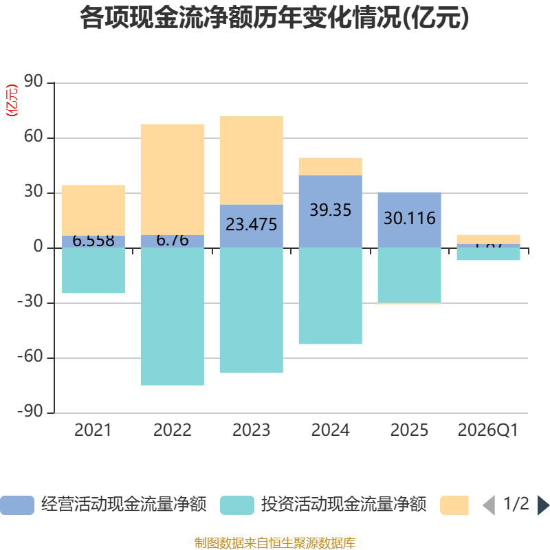 截至2026年一季度末,公司经营活动现金流净额为1.87亿元,同比下降79%;筹资活动现金流净额5亿元,同比增加2.47亿元;投资活动现金流净额-6.89亿元,上年同期为-10.18亿元。