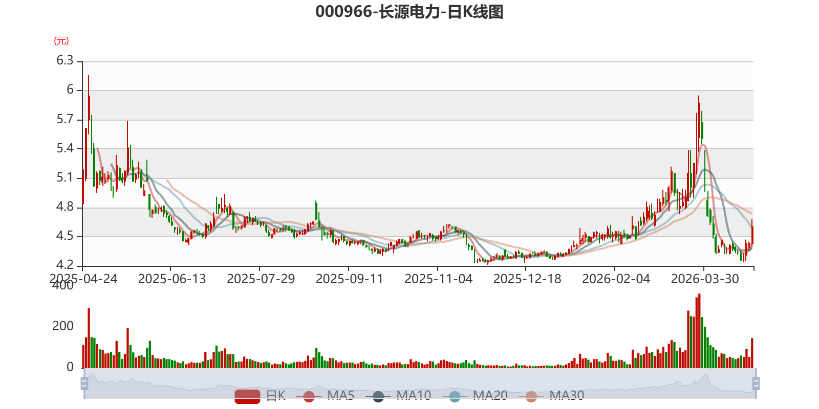 中证智能财讯长源电力(000966)4月24日披露2026年第一季度报告。公司实现营业总收入37.2亿元,同比增长11.73%;归母净利润1.05亿元,同比扭亏;扣非净利润9796.67万元,同比扭亏;经营活动产生的现金流量净额为1.87亿元,同比下降79.00%;报告期内,长源电力基本每股收益为0.0301元,加权平均净资产收益率为0.78%。