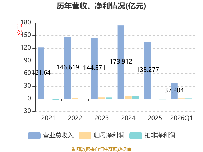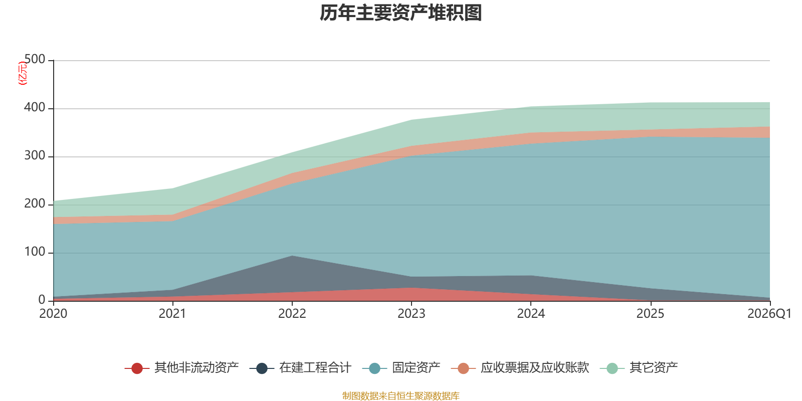 资产重大变化方面,截至2026年一季度末,公司在建工程合计较上年末减少78.22%,占公司总资产比重下降4.73个百分点;固定资产较上年末增加5.36%,占公司总资产比重上升3.98个百分点;应收票据及应收账款较上年末增加59.04%,占公司总资产比重上升2.12个百分点;存货较上年末减少49.11%,占公司总资产比重下降1.3个百分点。
