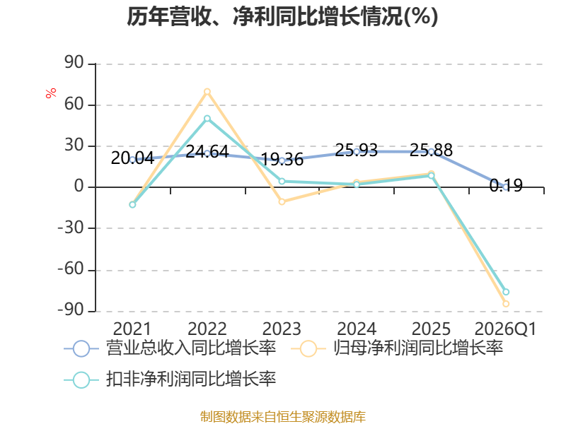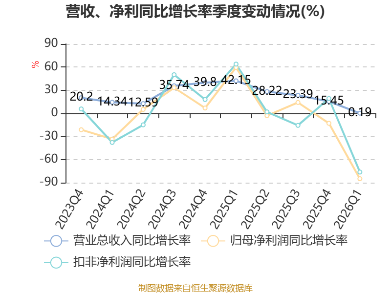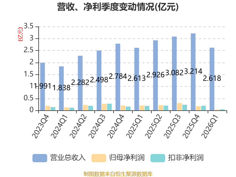 中证智能财讯安培龙(301413)4月24日披露2026年第一季度报告。公司实现营业总收入2.62亿元,同比增长0.19%;归母净利润309.18万元,同比下降84.82%;扣非净利润441.86万元,同比下降76.19%;经营活动产生的现金流量净额为-607万元,上年同期为-2563.27万元;报告期内,安培龙基本每股收益为0.03元,加权平均净资产收益率为0.24%。