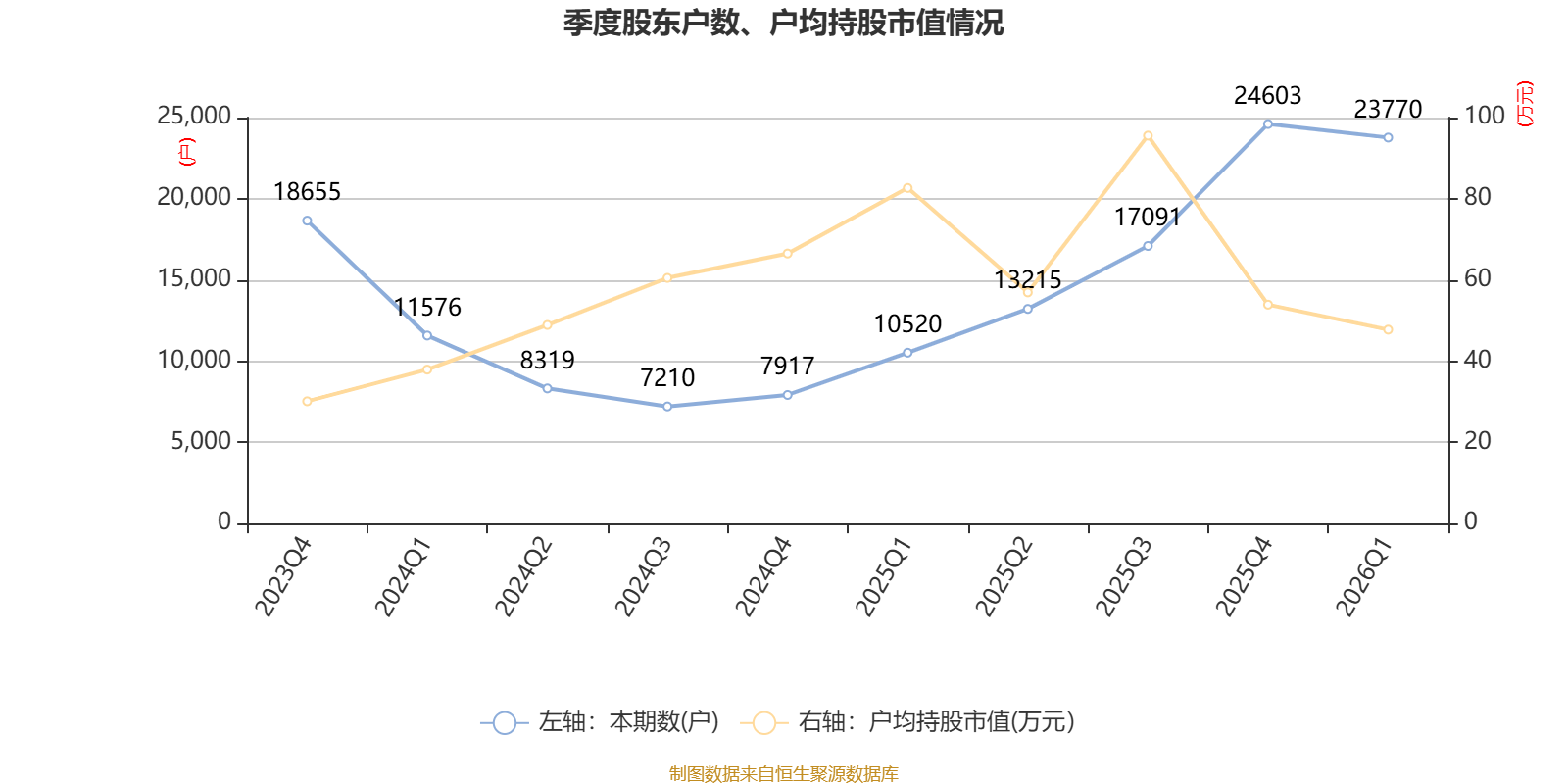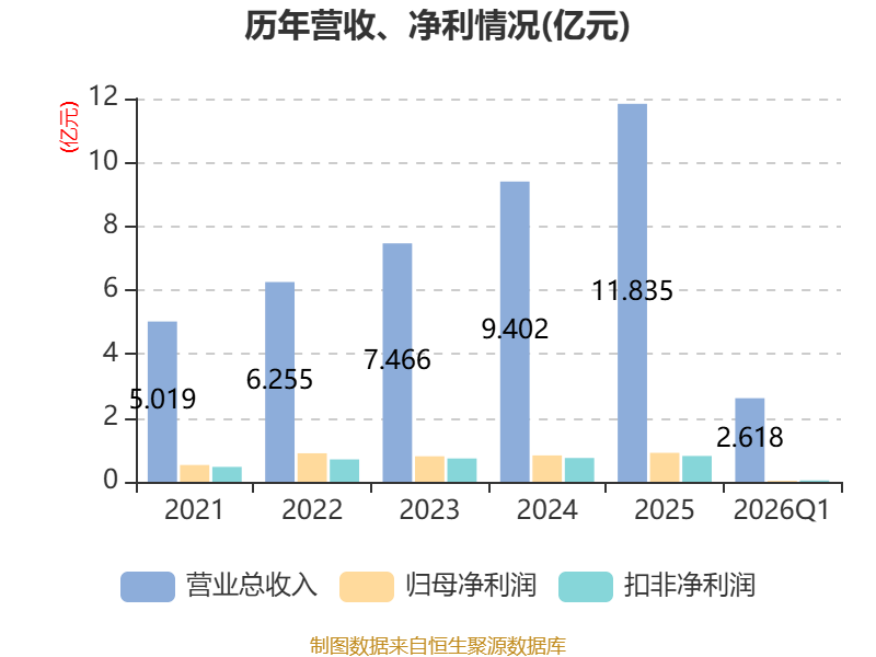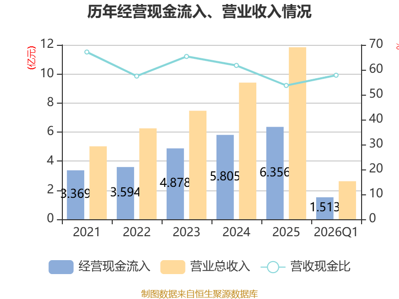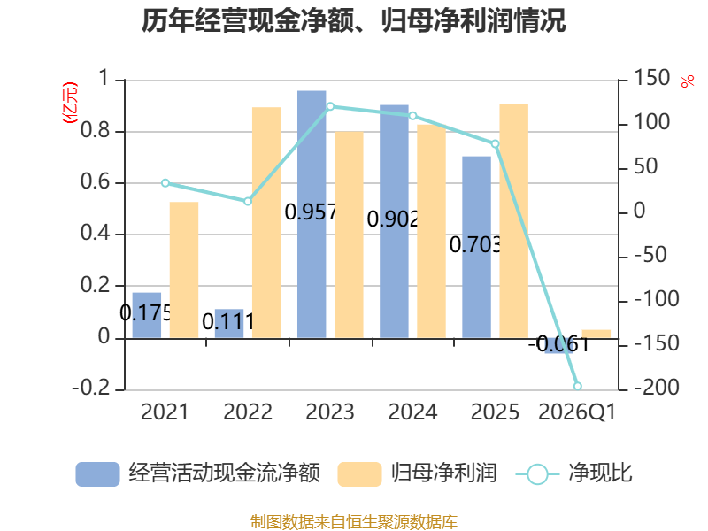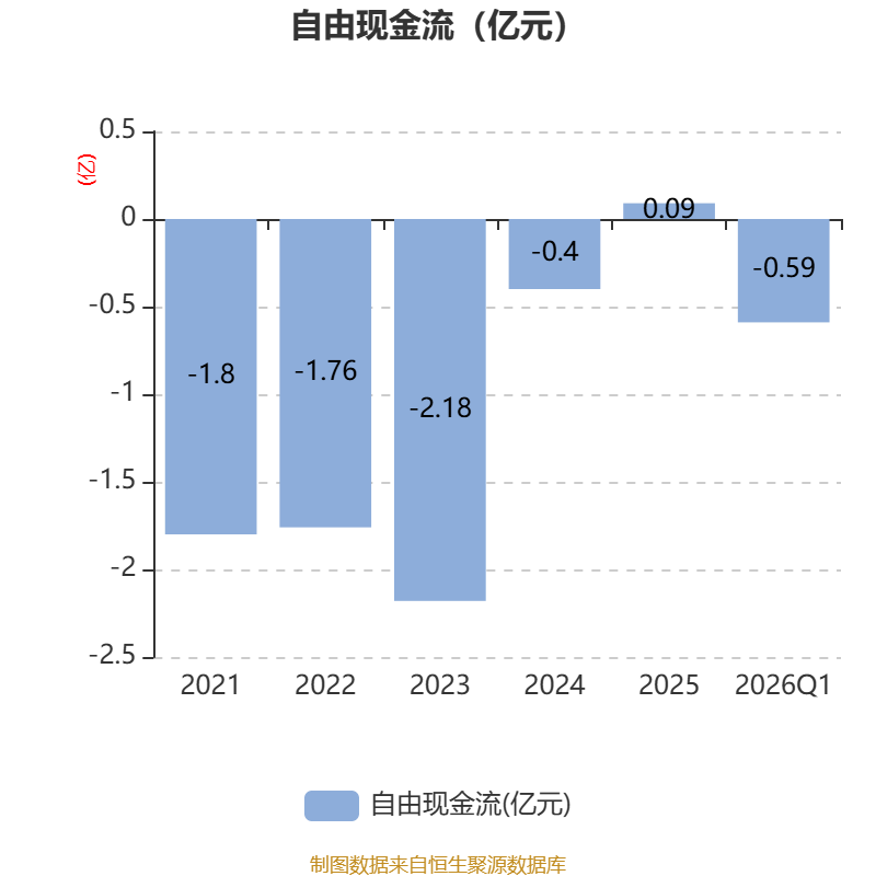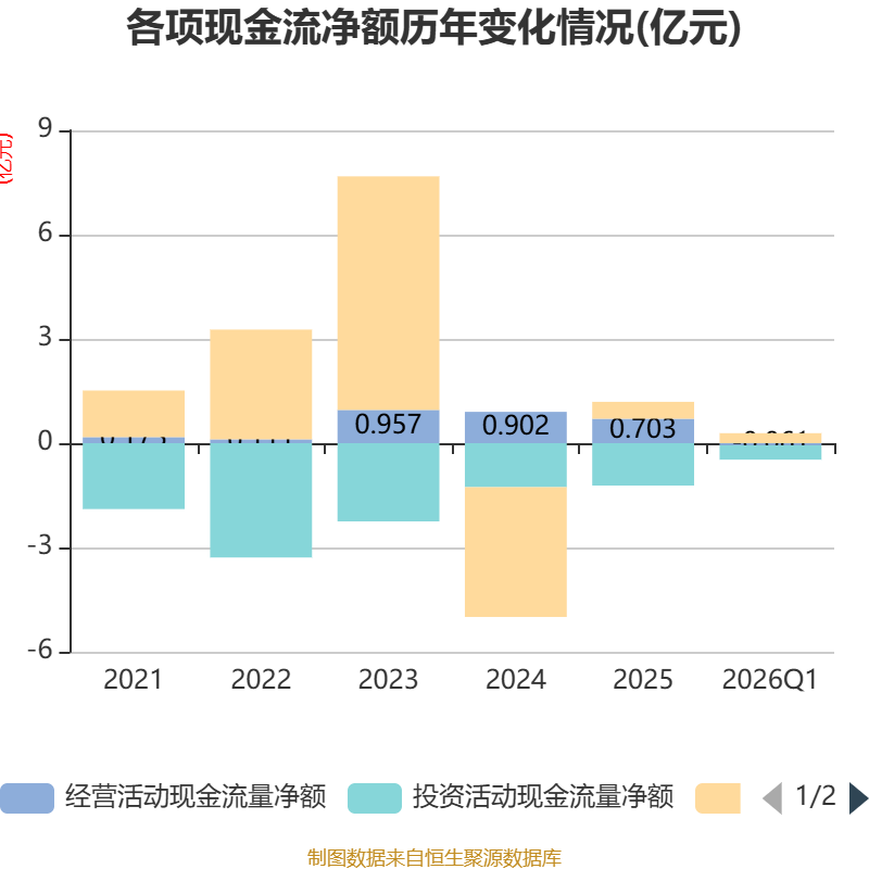 截至2026年一季度末,公司经营活动现金流净额为-607万元,同比增加1956.27万元;筹资活动现金流净额2879.05万元,同比减少6777.44万元;投资活动现金流净额-4124.78万元,上年同期为-2366.56万元。