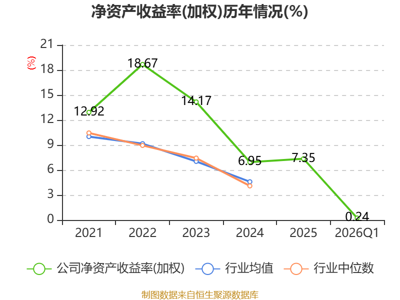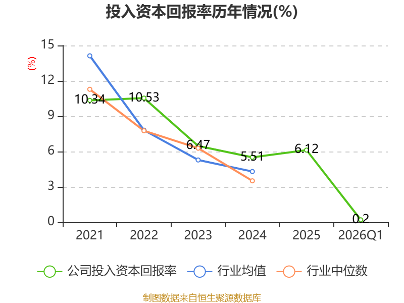 盈利能力方面, 2026年一季度公司加权平均净资产收益率为0.24%,同比下降1.44个百分点。公司2026年第一季度投入资本回报率为0.2%,较上年同期下降1.2个百分点。