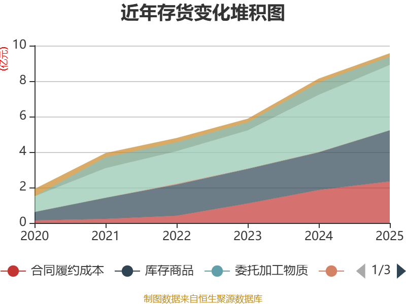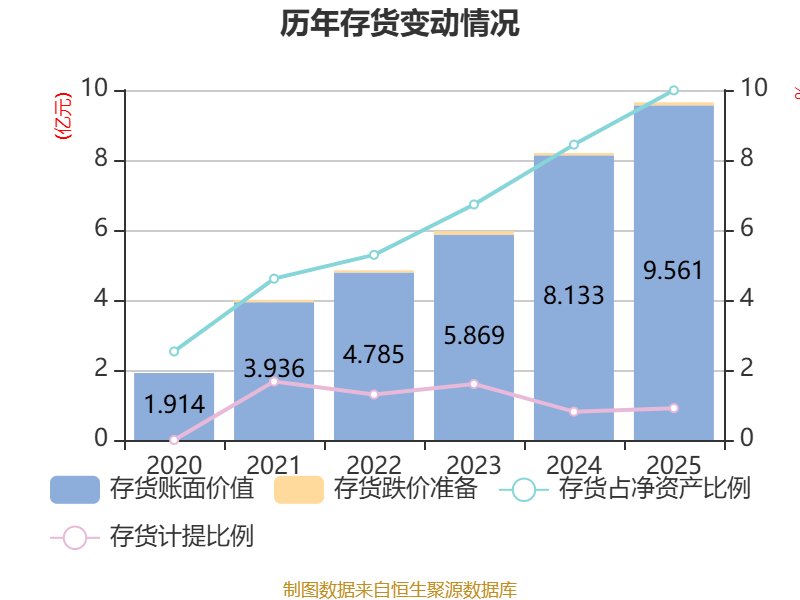 从存货变动来看,截至2025年末,公司存货账面价值为9.56亿元,占净资产的9.99%,较上年末增加1.43亿元。其中,存货跌价准备为876.64万元,计提比例为0.91%。