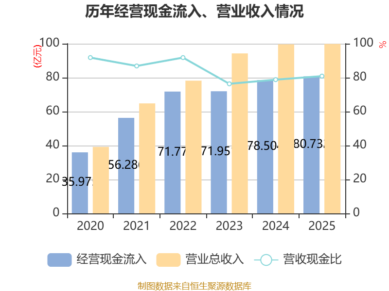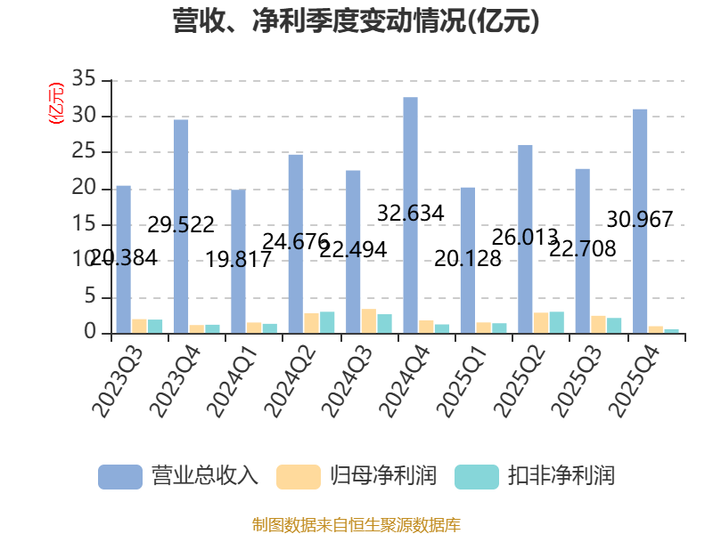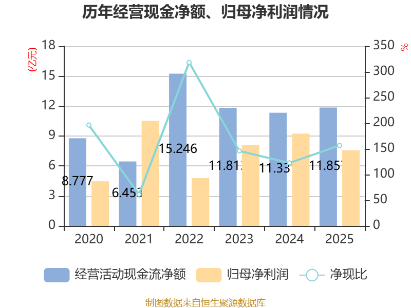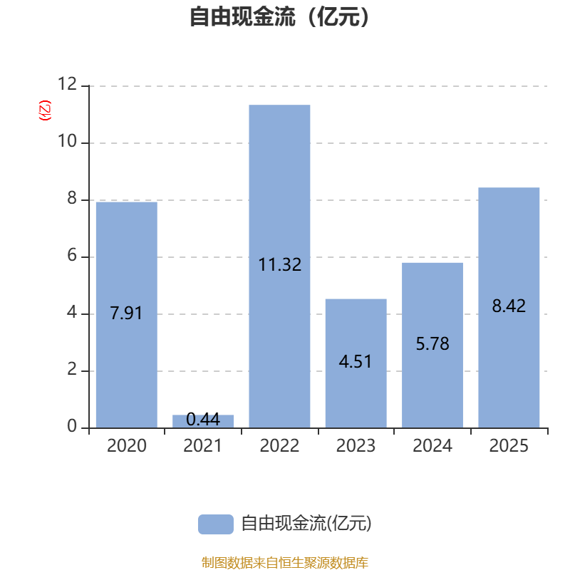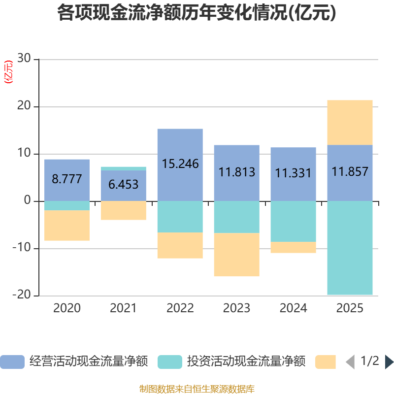 截至2025年,公司经营活动现金流净额为11.86亿元,同比增长4.64%;筹资活动现金流净额9.46亿元,同比增加11.81亿元;投资活动现金流净额-19.86亿元,上年同期为-8.66亿元。