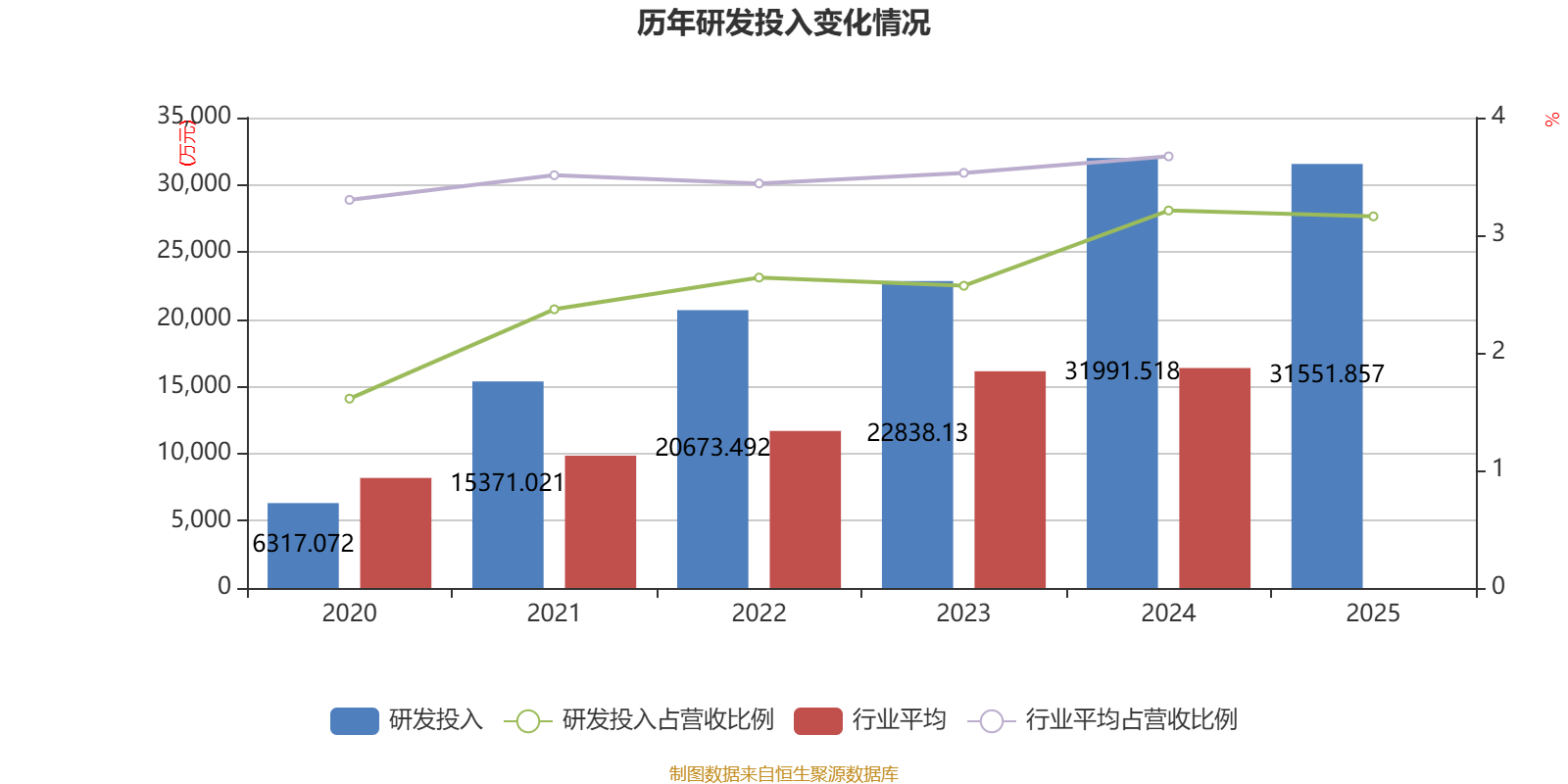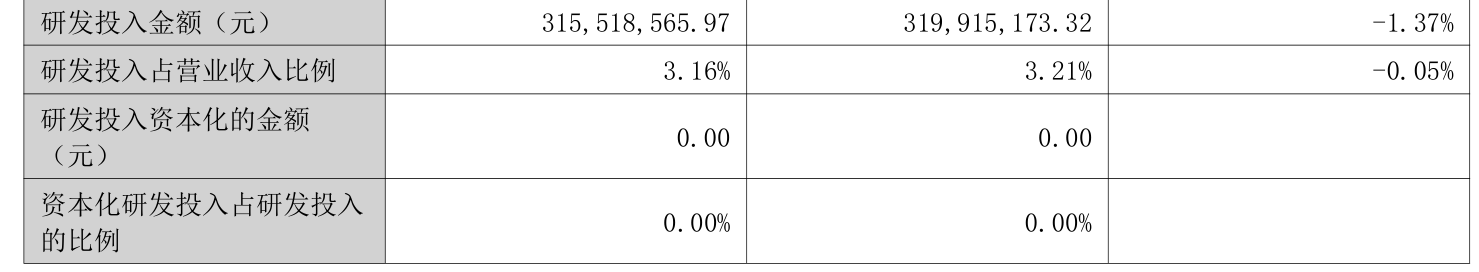 2025年全年,公司研发投入金额为3.16亿元,同比下降1.37%;研发投入占营业收入比例为3.16%,相比上年同期下降0.05个百分点。此外,公司全年研发投入资本化率为0%。