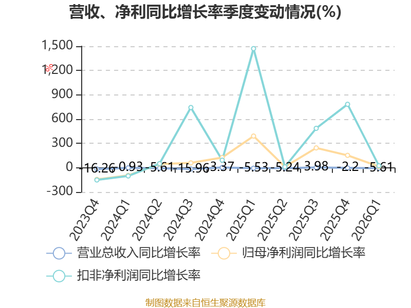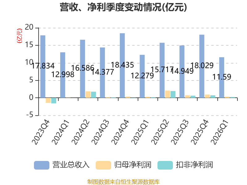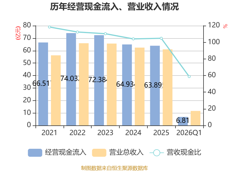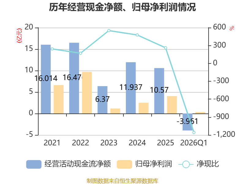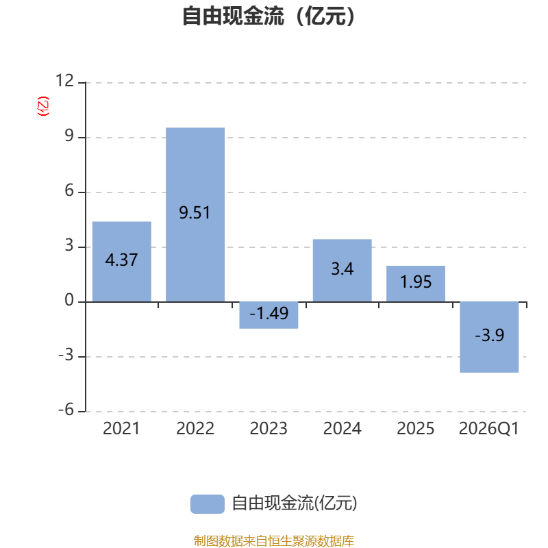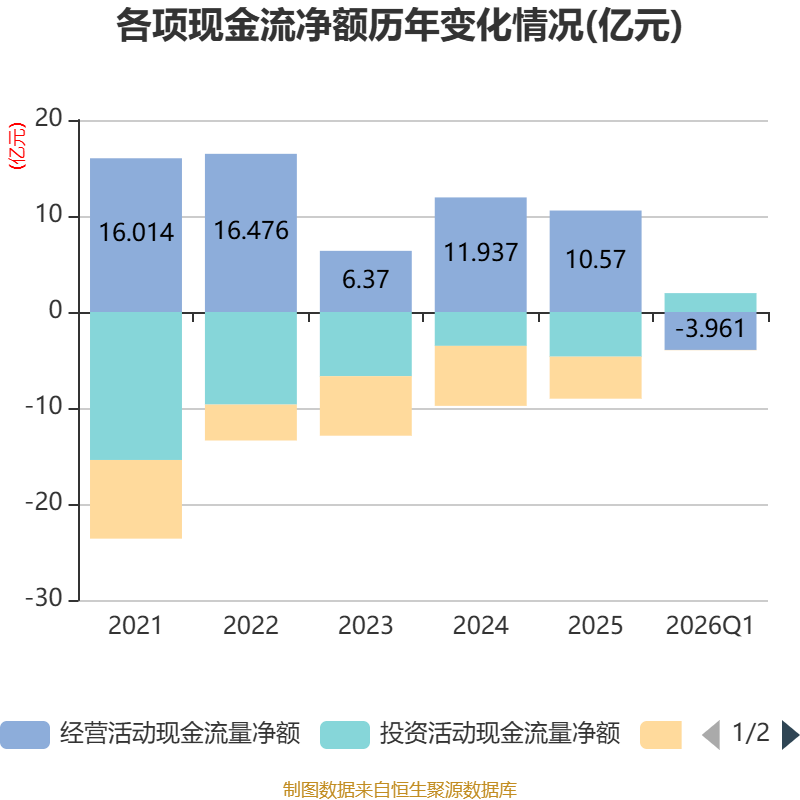 截至2026年一季度末,公司经营活动现金流净额为-3.96亿元,同比增加2.9亿元;筹资活动现金流净额-346.98万元,同比增加262.5万元;投资活动现金流净额1.97亿元,上年同期为-2.73亿元。