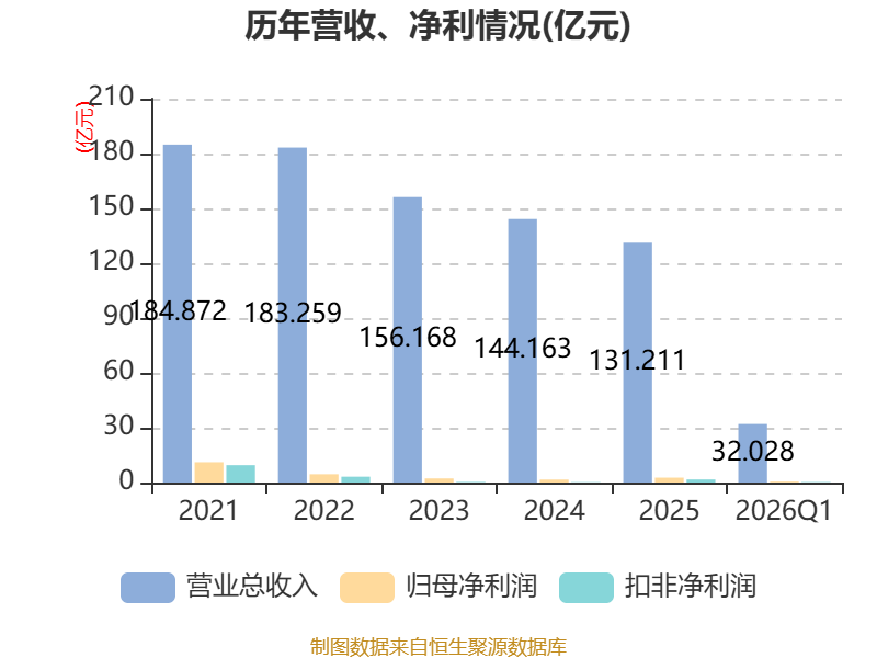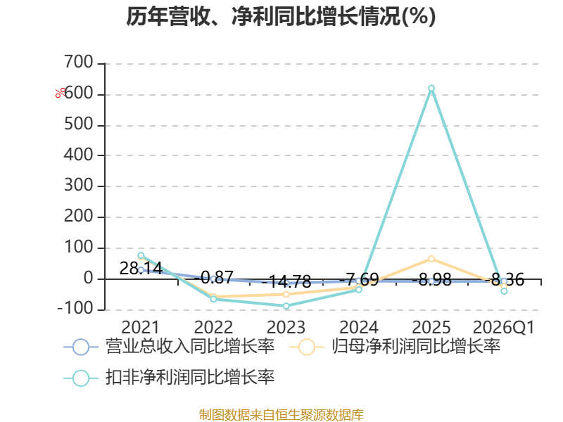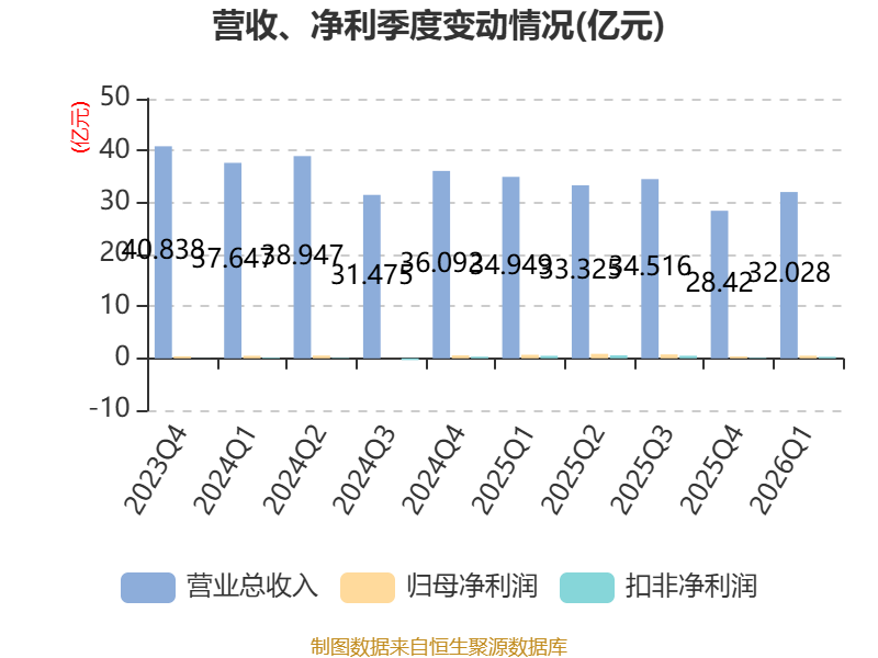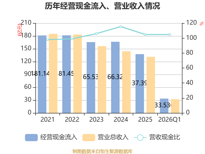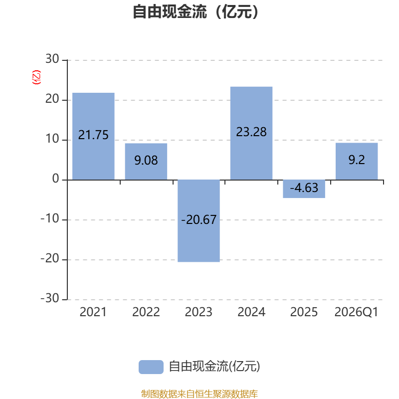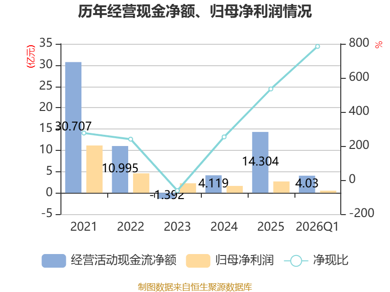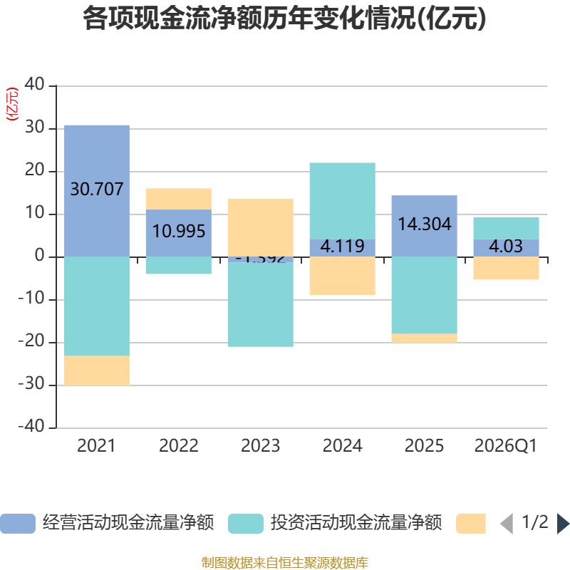 截至2026年一季度末,公司经营活动现金流净额为4.03亿元,同比下降47.82%;筹资活动现金流净额-5.38亿元,同比减少1.52亿元;投资活动现金流净额5.14亿元,上年同期为-8.03亿元。