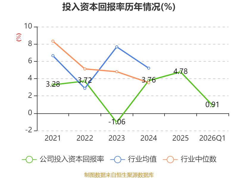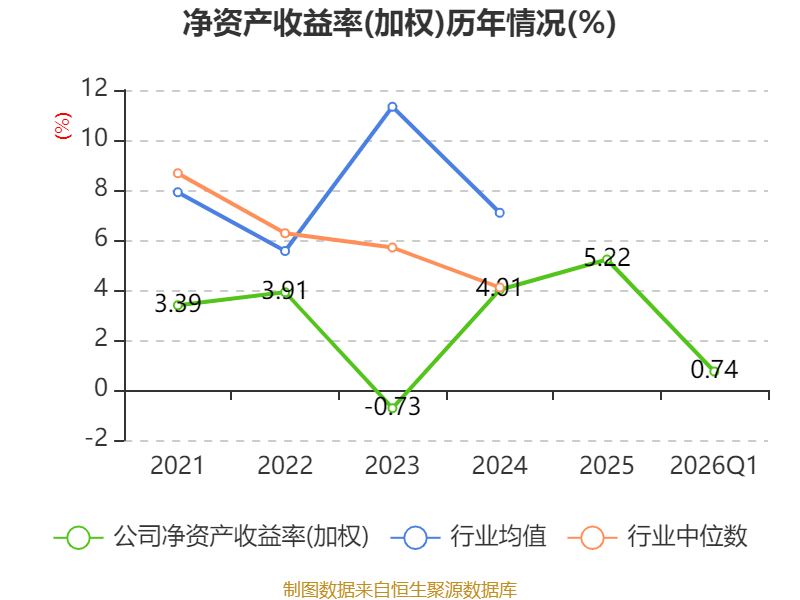 盈利能力方面, 2026年一季度公司加权平均净资产收益率为0.74%,同比下降1.27个百分点。公司2026年第一季度投入资本回报率为0.91%,较上年同期下降1.04个百分点。