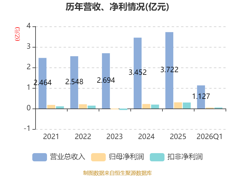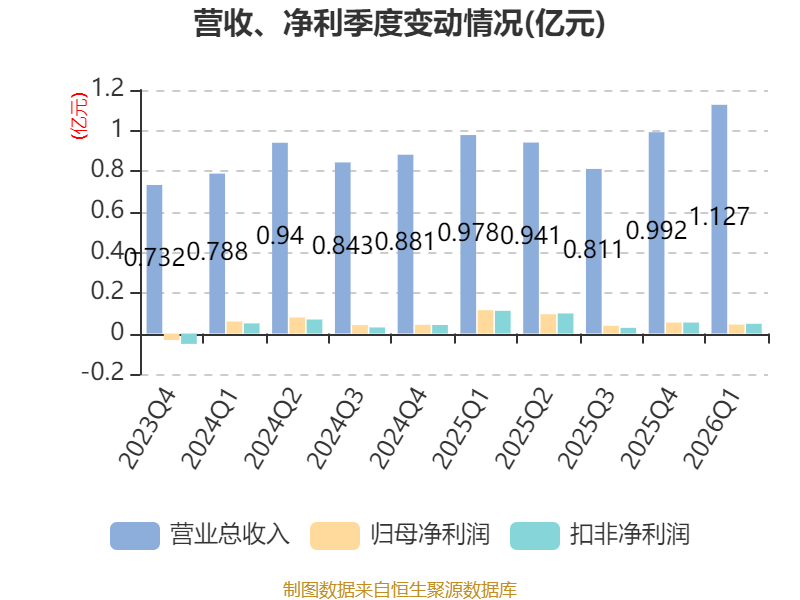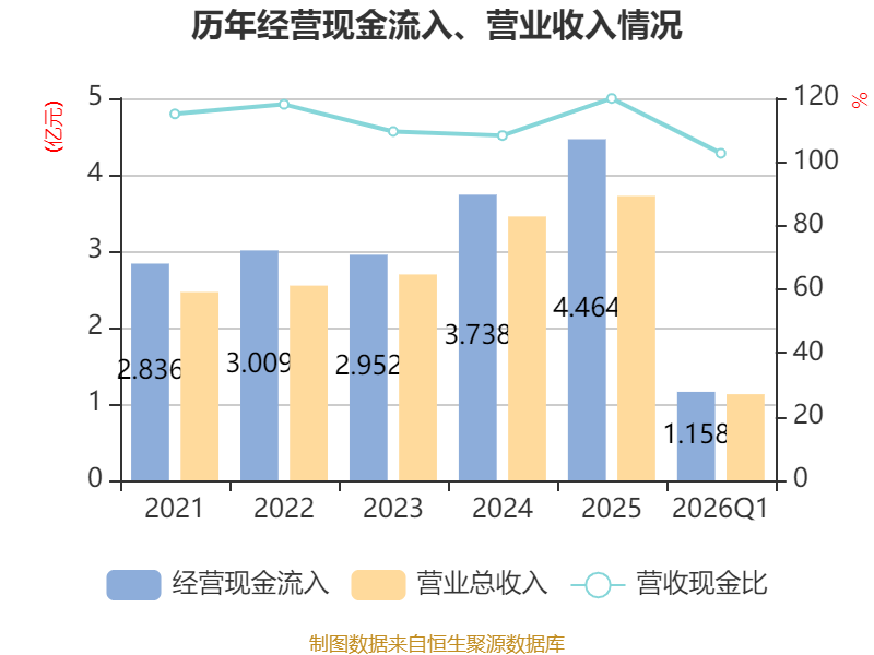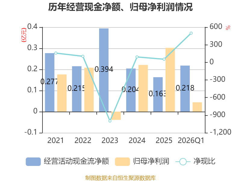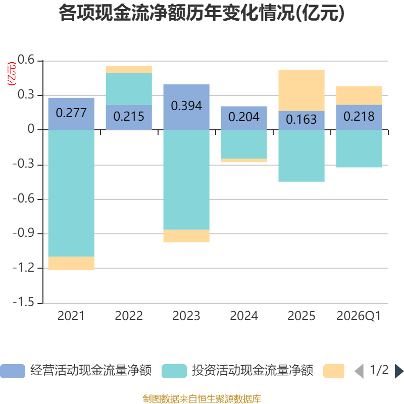 截至2026年一季度末,公司经营活动现金流净额为2182.08万元,同比增长77.16%;筹资活动现金流净额1610.16万元,同比增加1610.16万元;投资活动现金流净额-3248.19万元,上年同期为1639.42万元。