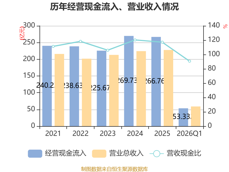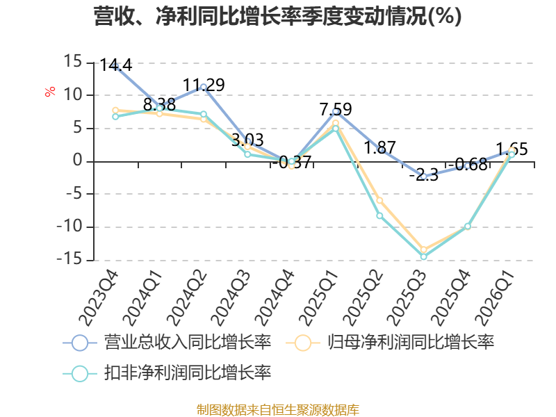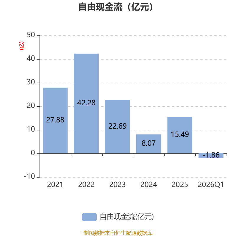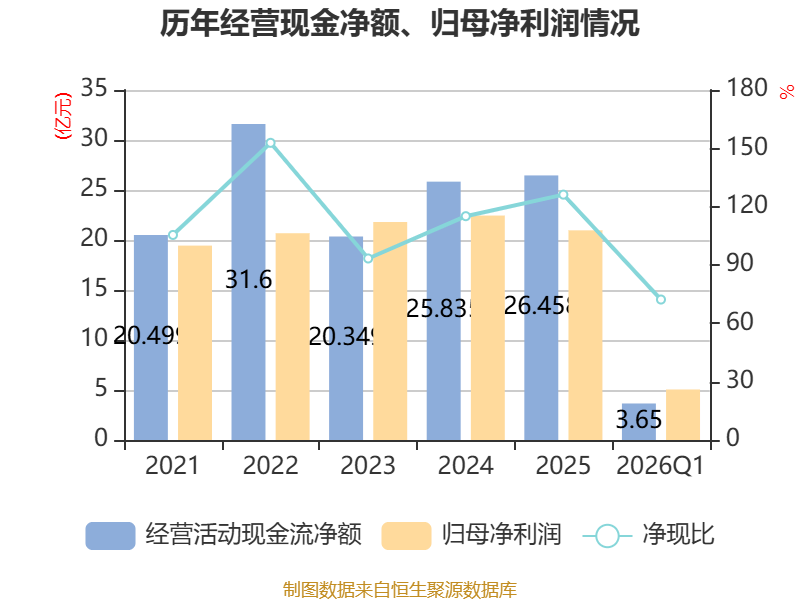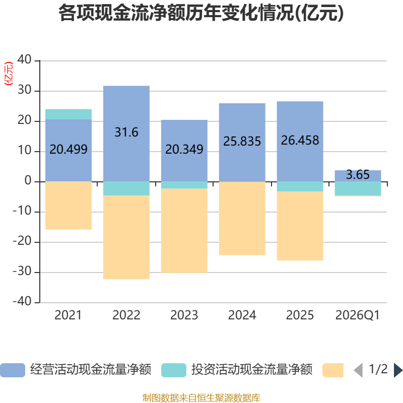 截至2026年一季度末,公司经营活动现金流净额为3.65亿元,同比下降37.48%;筹资活动现金流净额-1722.58万元,同比减少89.35万元;投资活动现金流净额-4.78亿元,上年同期为-7.29亿元。