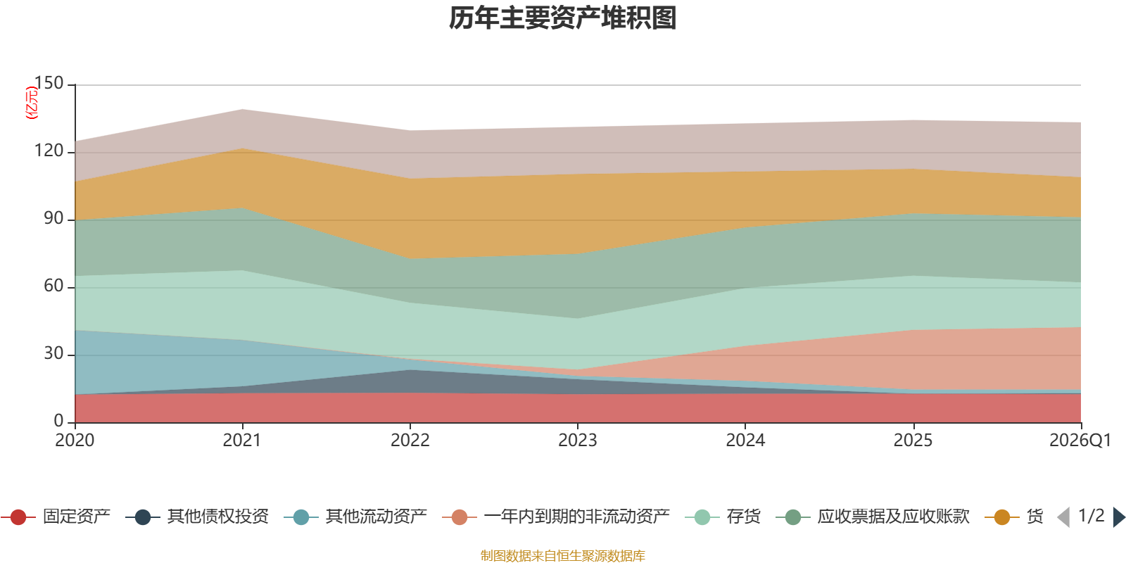 资产重大变化方面,截至2026年一季度末,公司存货较上年末减少17.18%,占公司总资产比重下降2.97个百分点;交易性金融资产合计较上年末增加86.56%,占公司总资产比重上升2.26个百分点;货币资金较上年末减少10.4%,占公司总资产比重下降1.43个百分点;应收票据及应收账款较上年末增加4.76%,占公司总资产比重上升1.15个百分点。