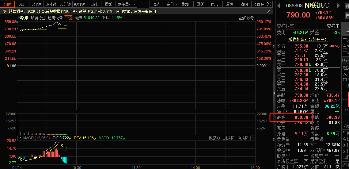 今日,光芯片测试设备厂商联讯仪器(688808.SH)正式登陆科创板,上市首日开盘价报736.92元/股,截至发稿,涨幅达864.83%。以单签500股、81.88元/股的发行价、上午盘中最高价859.88元/股计算,中一签赚38.9万元。