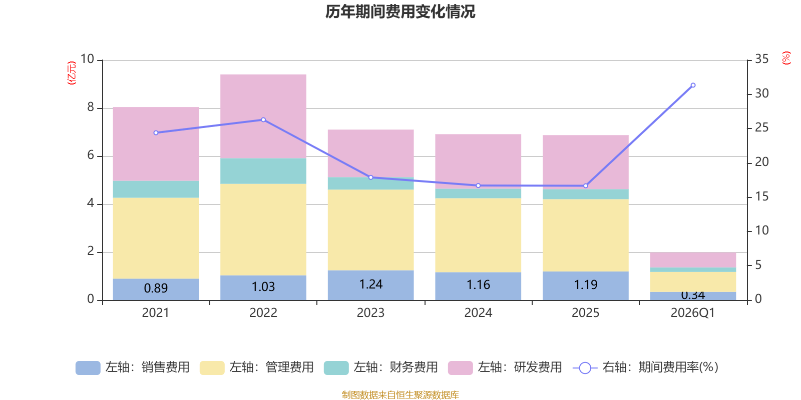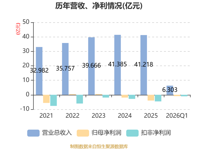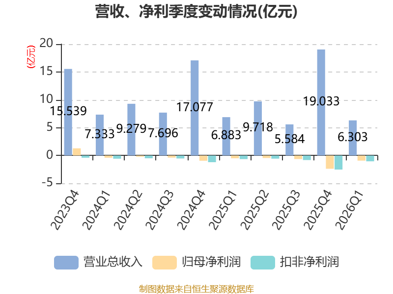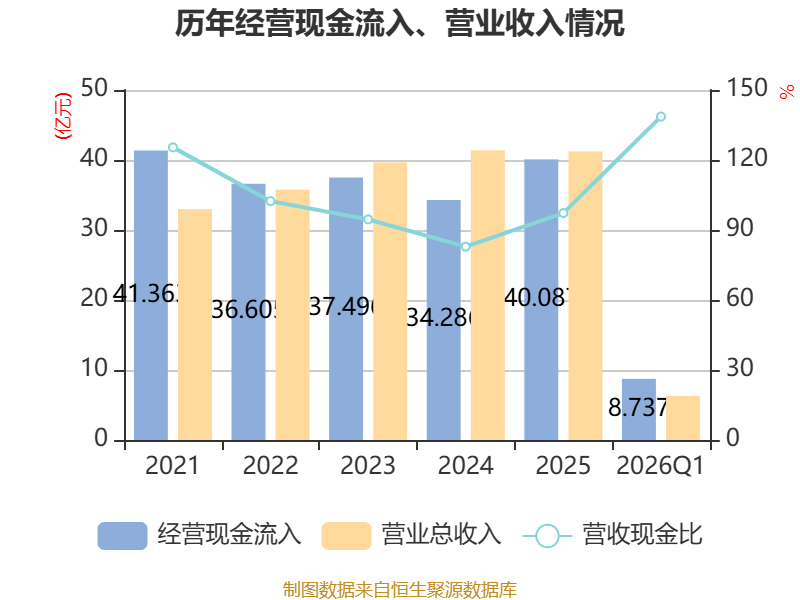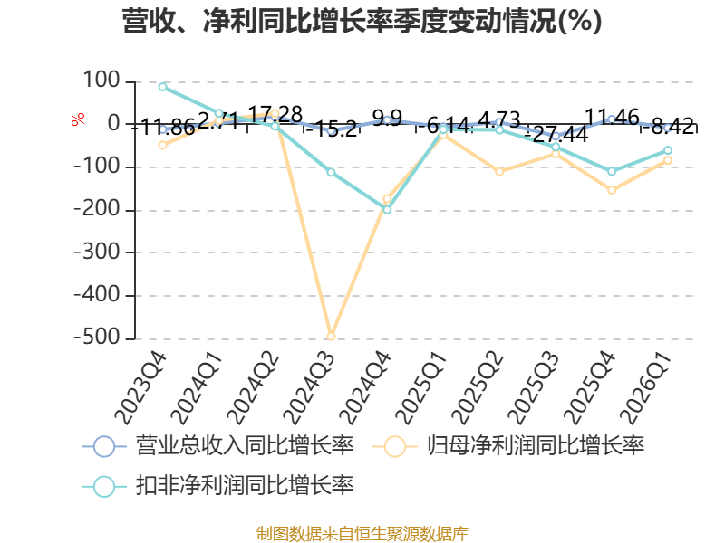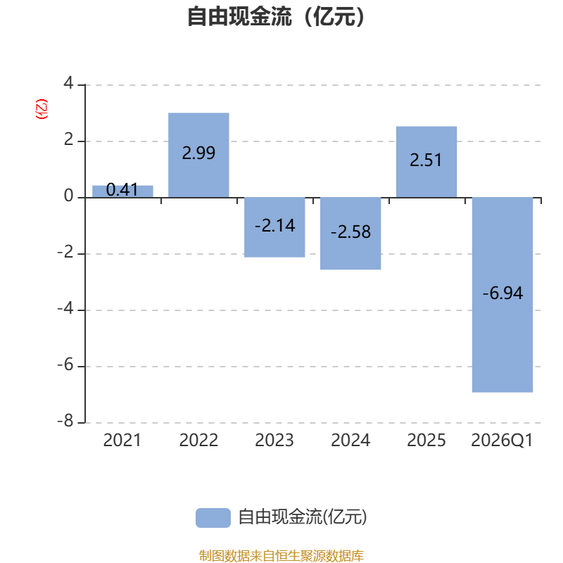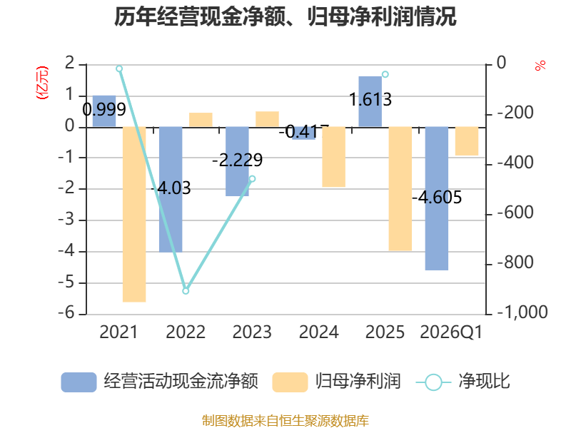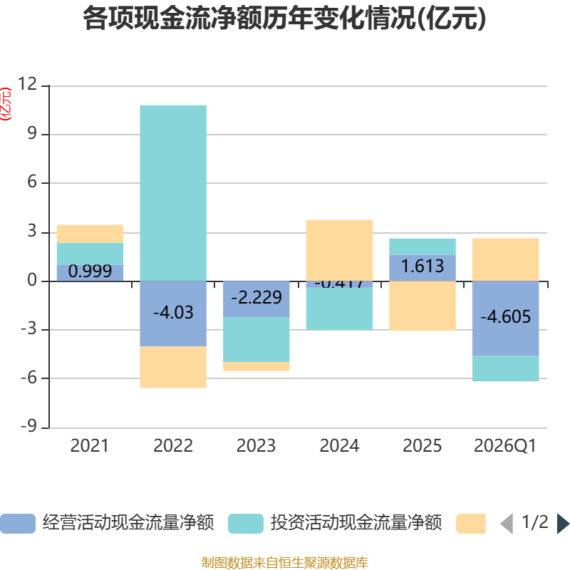截至2026年一季度末,公司经营活动现金流净额为-4.61亿元,同比减少2.21亿元;筹资活动现金流净额2.62亿元,同比增加1.55亿元;投资活动现金流净额-1.56亿元,上年同期为-1.07亿元。