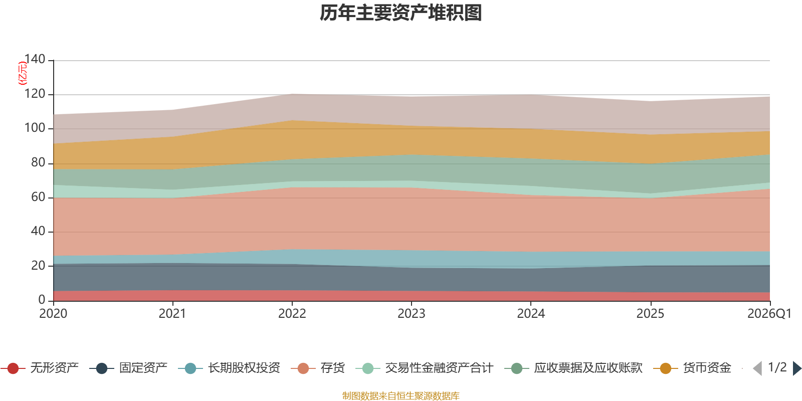 资产重大变化方面,截至2026年一季度末,公司存货较上年末增加17.73%,占公司总资产比重上升4.01个百分点;货币资金较上年末减少20.13%,占公司总资产比重下降3.21个百分点;应收票据及应收账款较上年末减少5.44%,占公司总资产比重下降1.13个百分点;交易性金融资产合计较上年末增加30.03%,占公司总资产比重上升0.66个百分点。