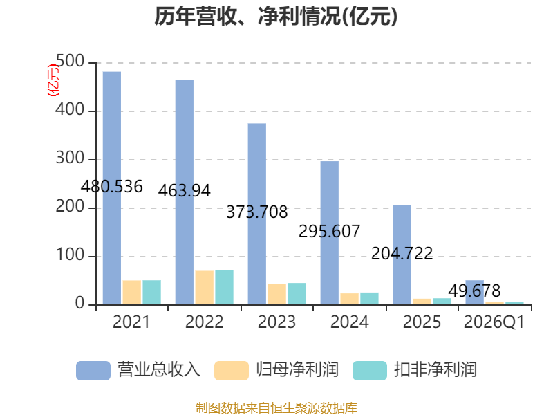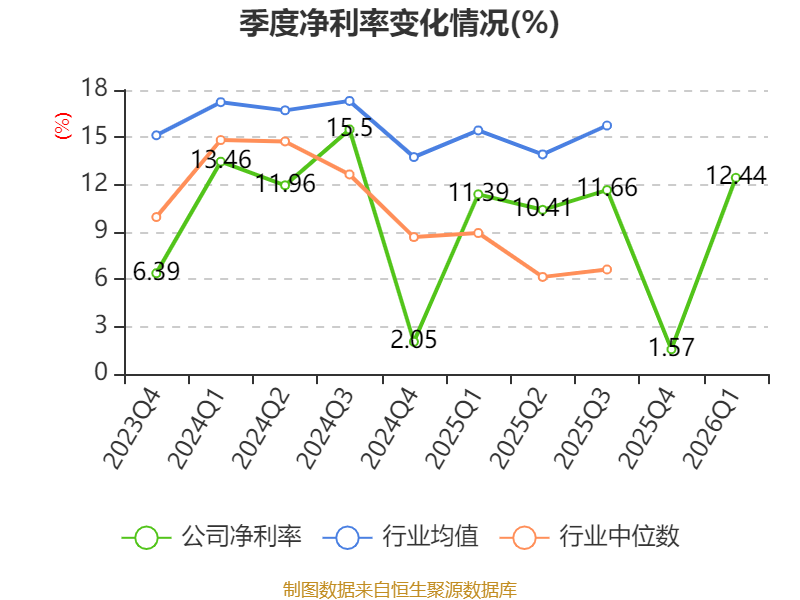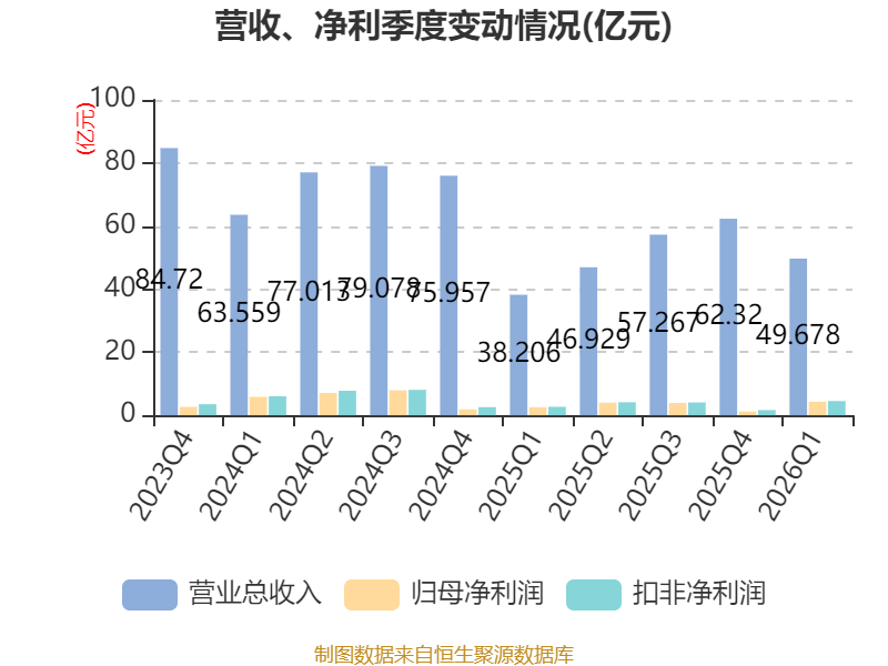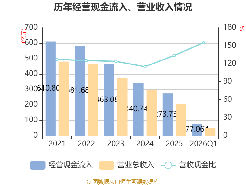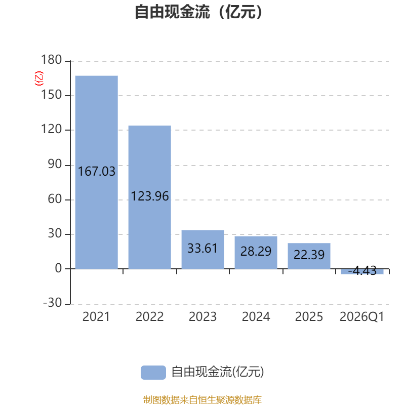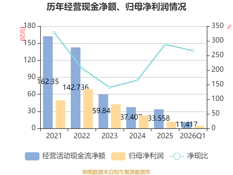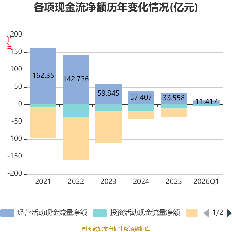 截至2026年一季度末,公司经营活动现金流净额为11.42亿元,同比增加22.79亿元;筹资活动现金流净额-1.86亿元,同比减少19.65亿元;投资活动现金流净额-3.9亿元,上年同期为-3.92亿元。