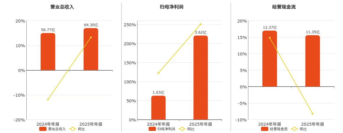 公司营业总收入为64.30亿元。归母净利润为3.62亿元。经营活动现金净流入为11.35亿元,较去年同报告期经营活动现金净流入减少1.02亿元,同比较去年同期下降8.23%。