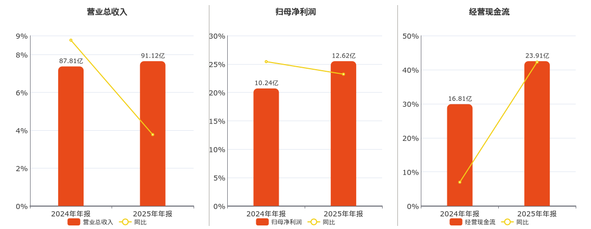 公司营业总收入为91.12亿元。归母净利润为12.62亿元。经营活动现金净流入为23.91亿元。