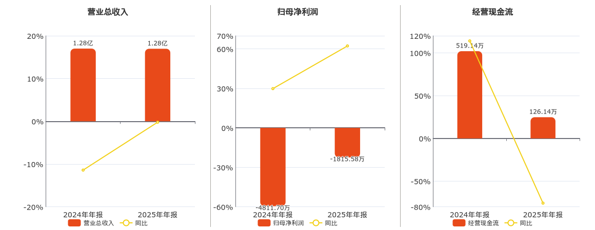 公司营业总收入为1.28亿元,在已披露的同业公司中排名第52,较去年同报告期营业总收入减少27.49万元,同比较去年同期下降0.21%。归母净利润为-1815.58万元,在已披露的同业公司中排名第43。经营活动现金净流入为126.14万元,在已披露的同业公司中排名第45,较去年同报告期经营活动现金净流入减少393.01万元,同比较去年同期下降75.70%。