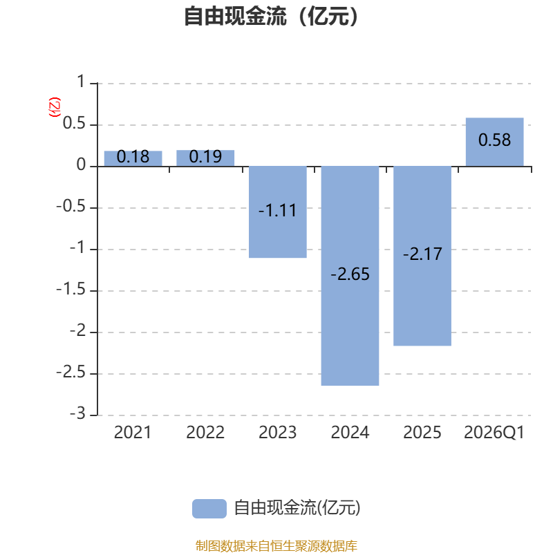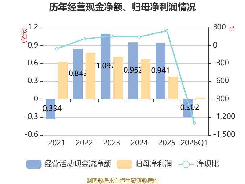截至2026年一季度末,公司经营活动现金流净额为-3017.44万元,同比增加2572.12万元;筹资活动现金流净额-1.22亿元,同比减少7830.61万元;投资活动现金流净额8488.47万元,上年同期为-6300.15万元。