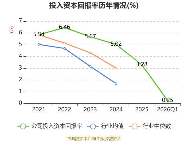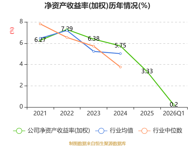 盈利能力方面, 2026年一季度公司加权平均净资产收益率为0.2%,同比下降0.83个百分点。公司2026年第一季度投入资本回报率为0.25%,较上年同期下降0.63个百分点。