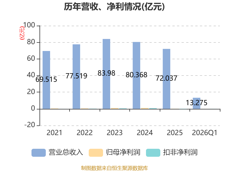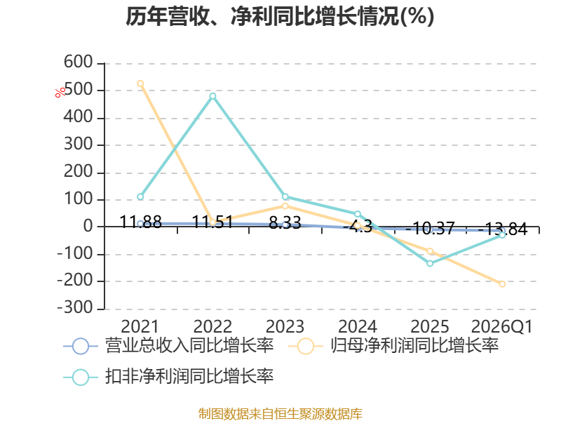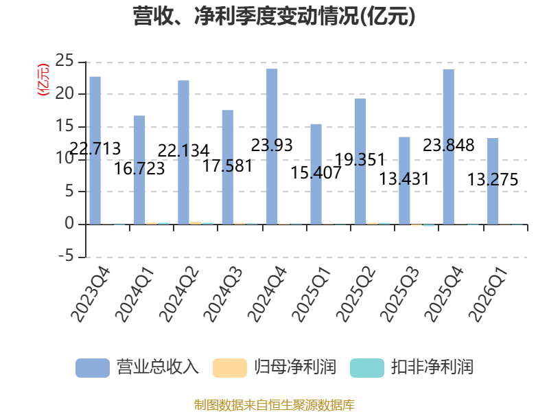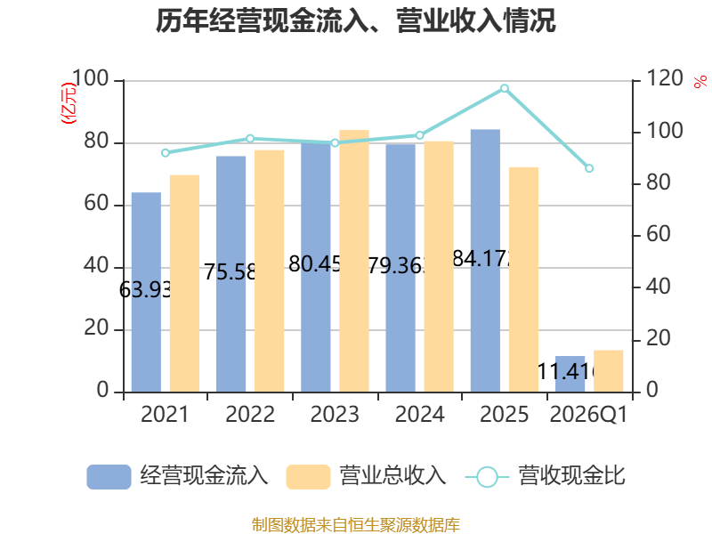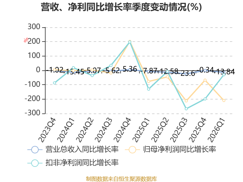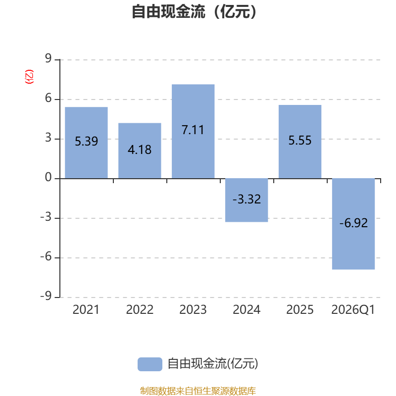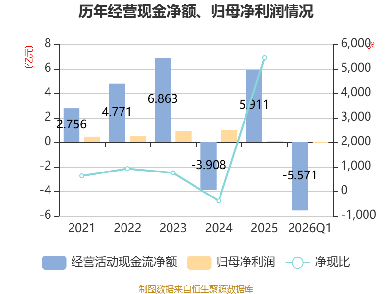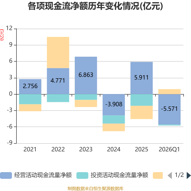 截至2026年一季度末,公司经营活动现金流净额为-5.57亿元,同比减少3.26亿元;筹资活动现金流净额9140.23万元,同比增加1.4亿元;投资活动现金流净额-1826.74万元,上年同期为-3175.17万元。