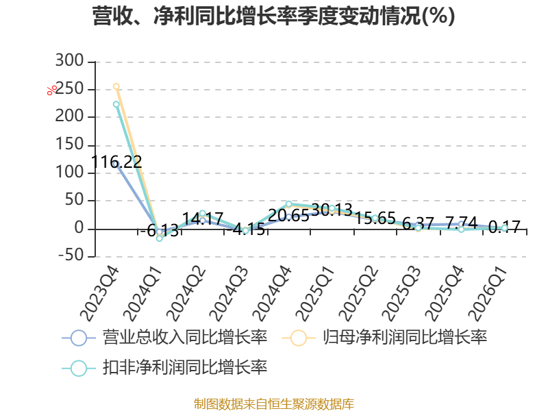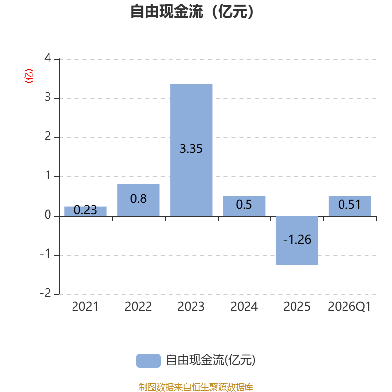 截至2026年一季度末,公司经营活动现金流净额为5612.59万元,同比增长108.89%;筹资活动现金流净额-49.55万元,同比减少13.82万元;投资活动现金流净额-6037.93万元,上年同期为156.22万元。