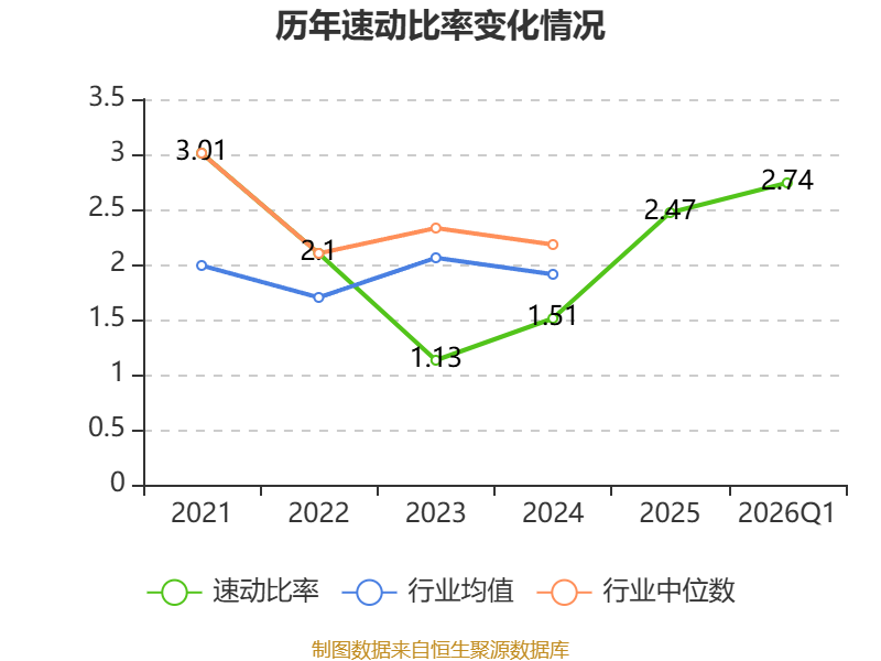 2026年第一季度,公司流动比率为2.77,速动比率为2.74。