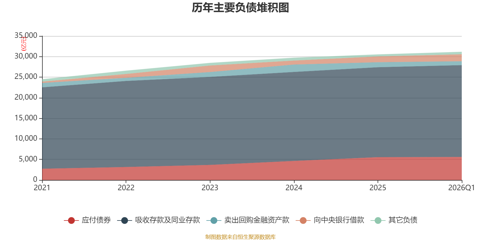 负债重大变化方面,截至2026年一季度末,公司卖出回购金融资产款较上年末减少23.67%,占公司总资产比重下降0.94个百分点;向中央银行借款较上年末增加20.83%,占公司总资产比重上升0.78个百分点;拆入资金较上年末增加45.8%,占公司总资产比重上升0.23个百分点;应付债券较上年末增加0.89%,占公司总资产比重下降0.2个百分点。