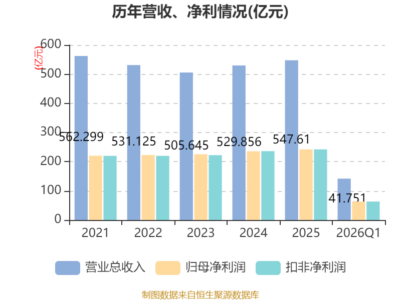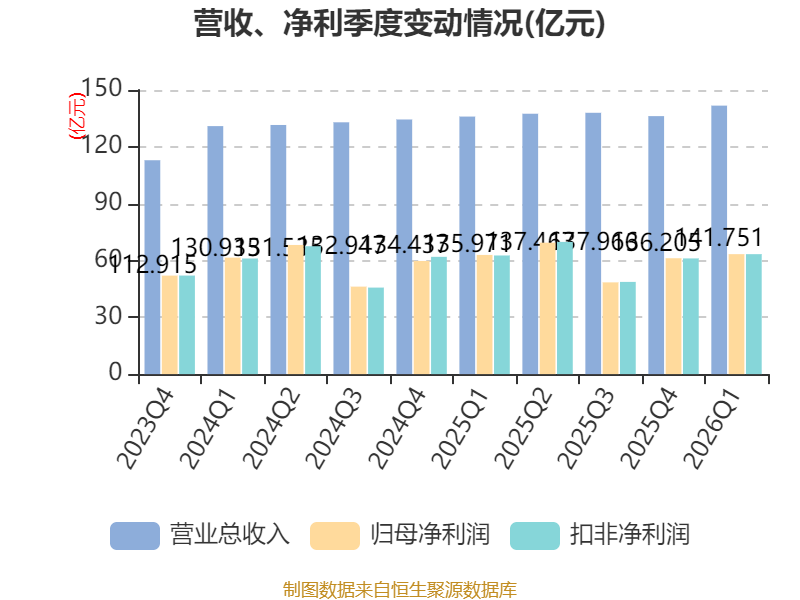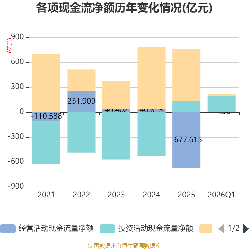 截至2026年一季度末,公司经营活动现金流净额为-1.36亿元,同比增加1437.23亿元;筹资活动现金流净额21.11亿元,同比减少1011.44亿元;投资活动现金流净额194.47亿元,上年同期为546.44亿元。