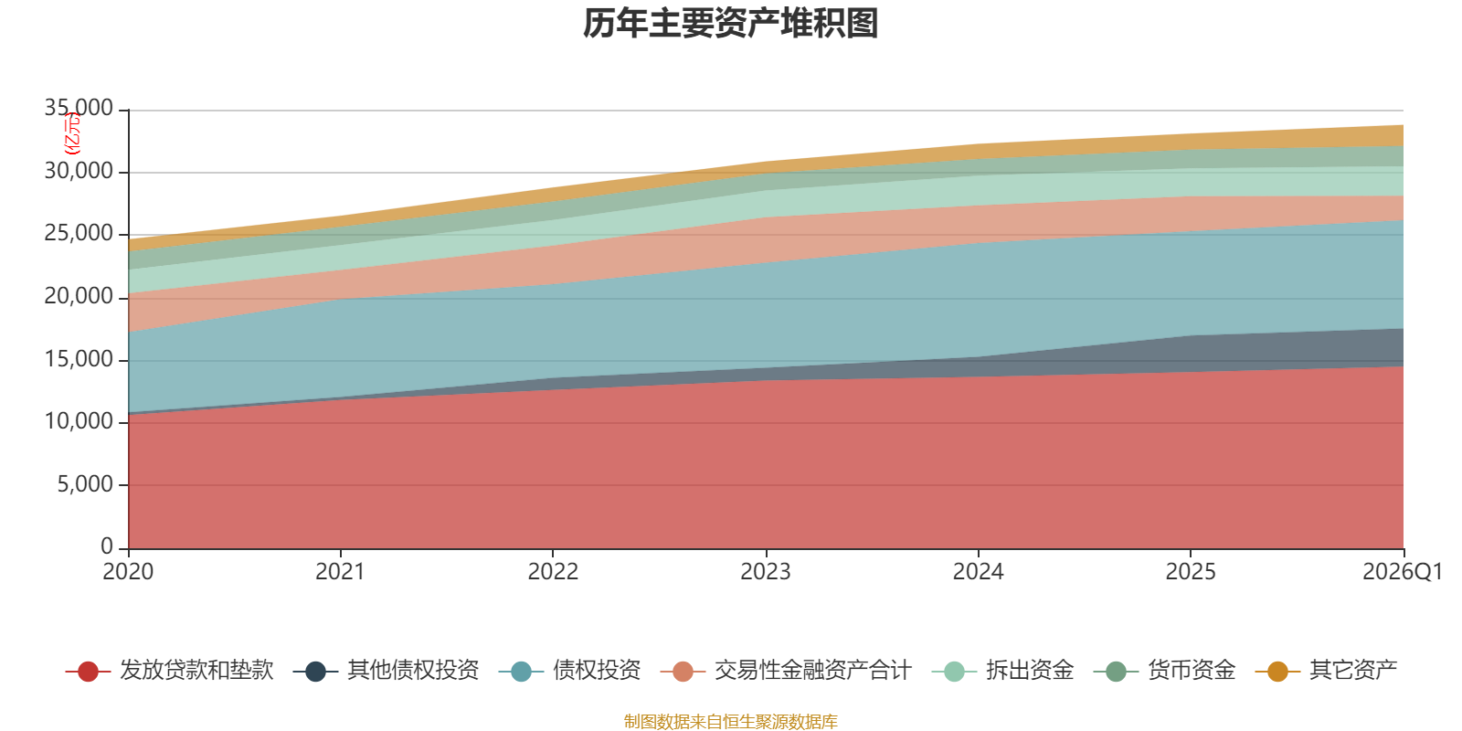 资产重大变化方面,截至2026年一季度末,公司交易性金融资产合计较上年末减少30.45%,占公司总资产比重下降2.68个百分点;买入返售金融资产较上年末增加358.82%,占公司总资产比重上升1.16个百分点;债权投资较上年末增加3.81%,占公司总资产比重上升0.42个百分点;发放贷款和垫款较上年末增加3.08%,占公司总资产比重上升0.4个百分点。