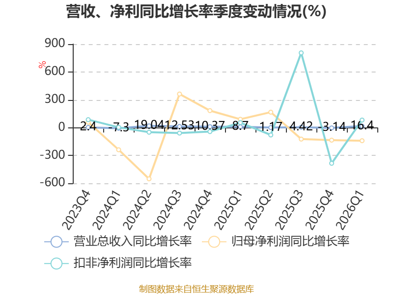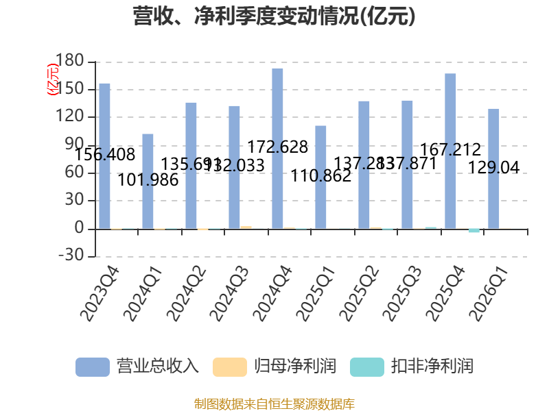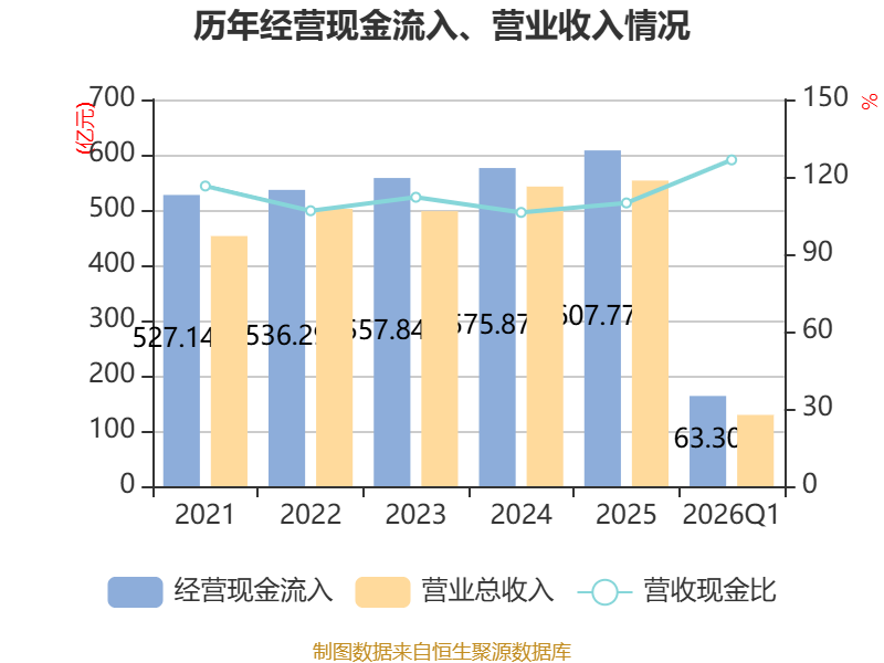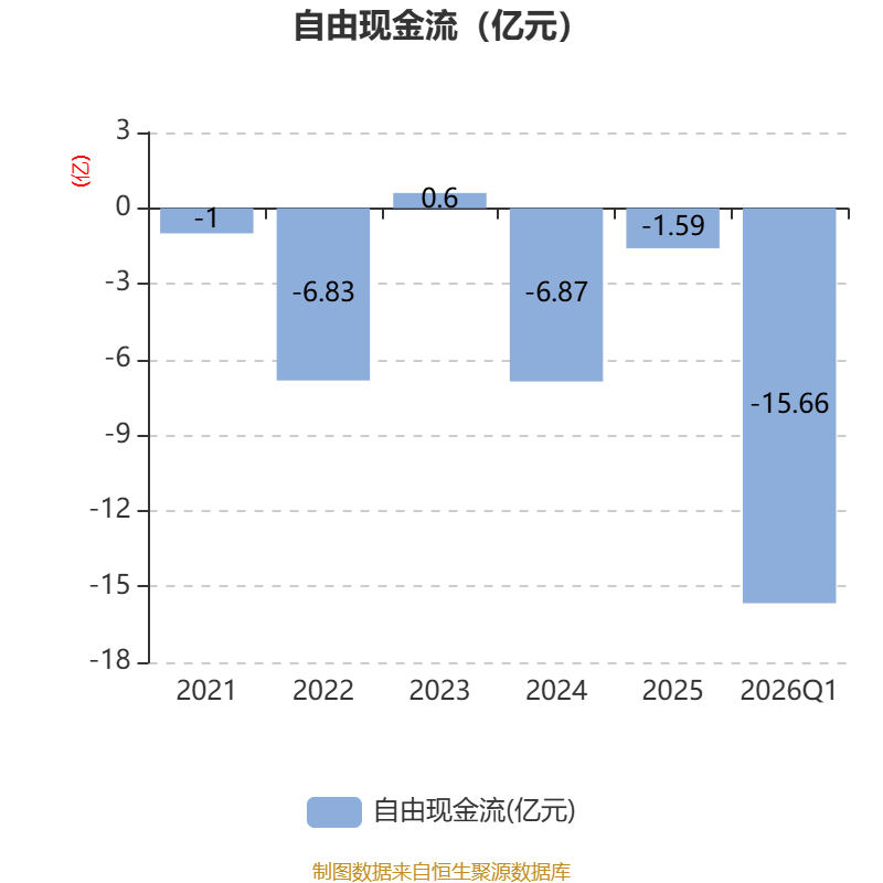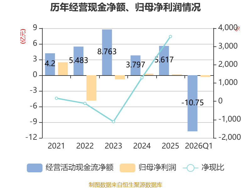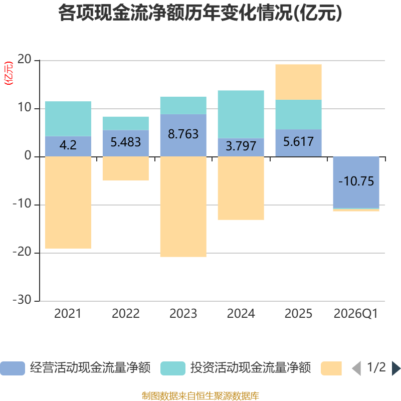 截至2026年一季度末,公司经营活动现金流净额为-10.75亿元,同比减少6.9亿元;筹资活动现金流净额-4566.26万元,同比减少7.1亿元;投资活动现金流净额-2016.74万元,上年同期为-1039.62万元。